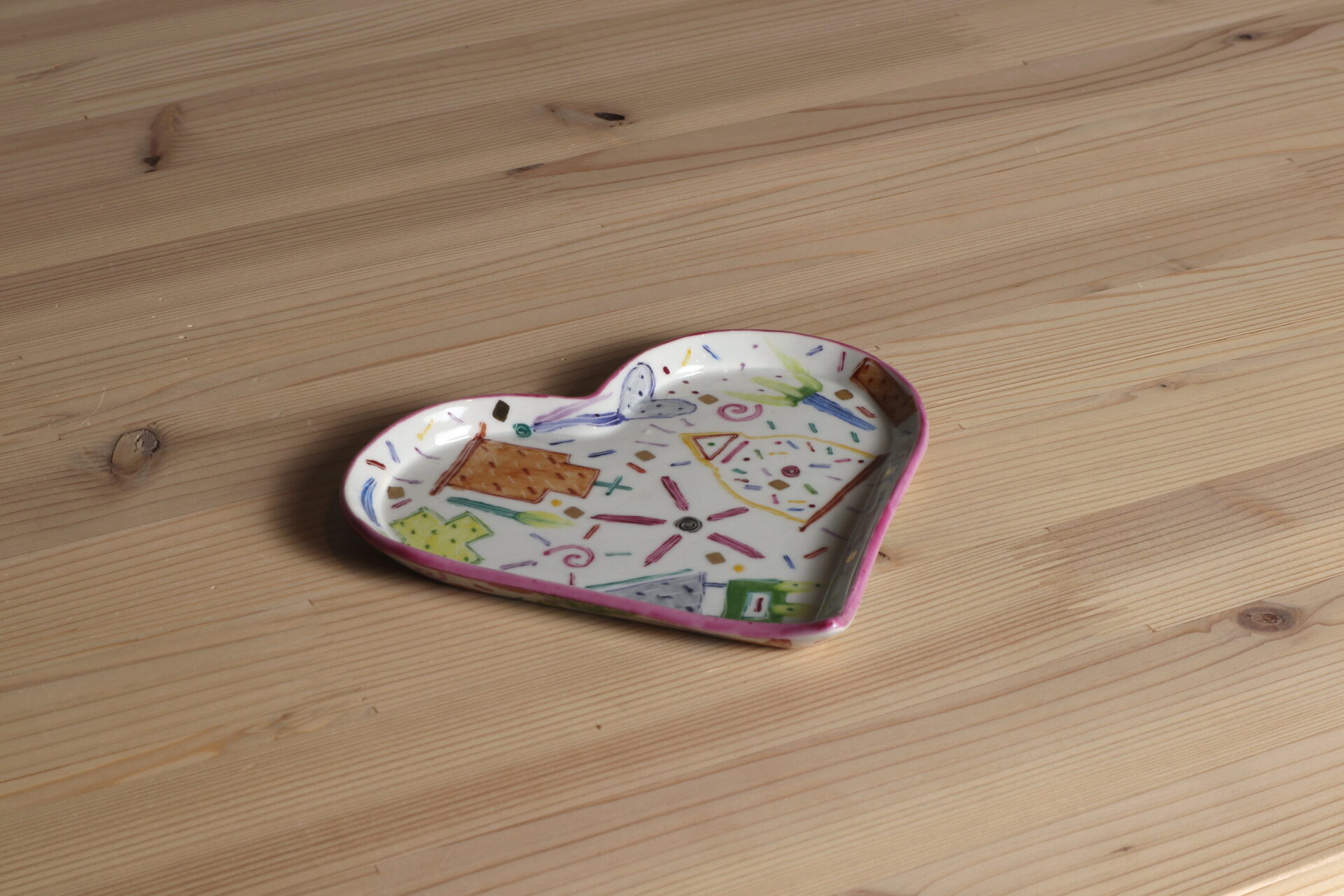 川口淳さんのハート小皿です。おもちゃ箱をひっくり返したような楽しく愛らしい絵付け。日常使いに彩りを与えてくれる器です。
