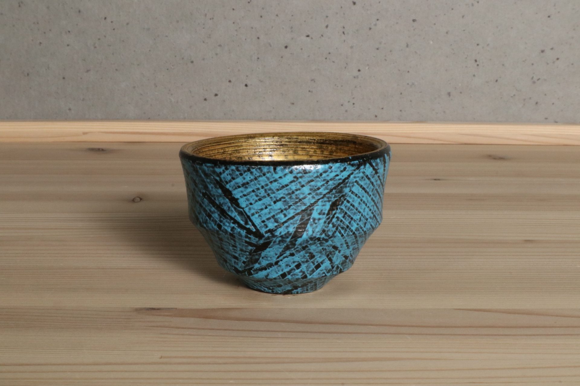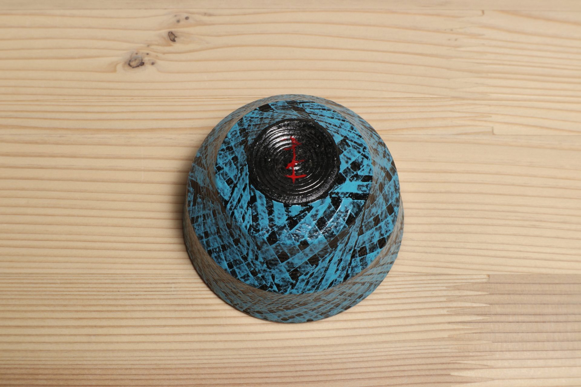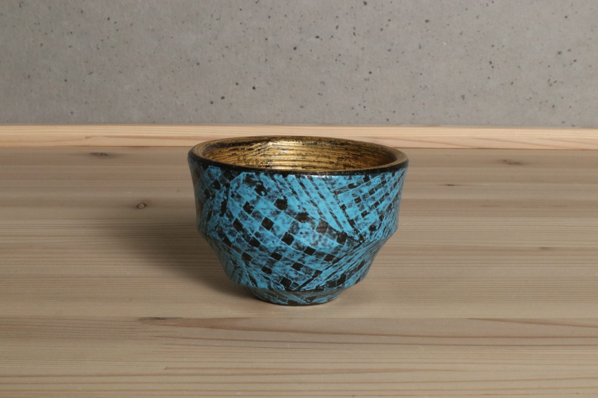 前田正博さんの白磁をキャンバスに市松文様をモチーフとしたぐい呑。マスキングにより何度も色を塗り重ねて焼成を繰り返すことで、黒とブルーがポップで枯せた意匠に。見込みは黒と金の根来風の仕上げになっています。