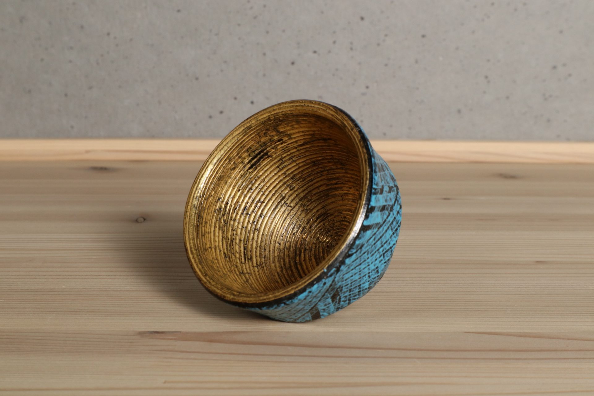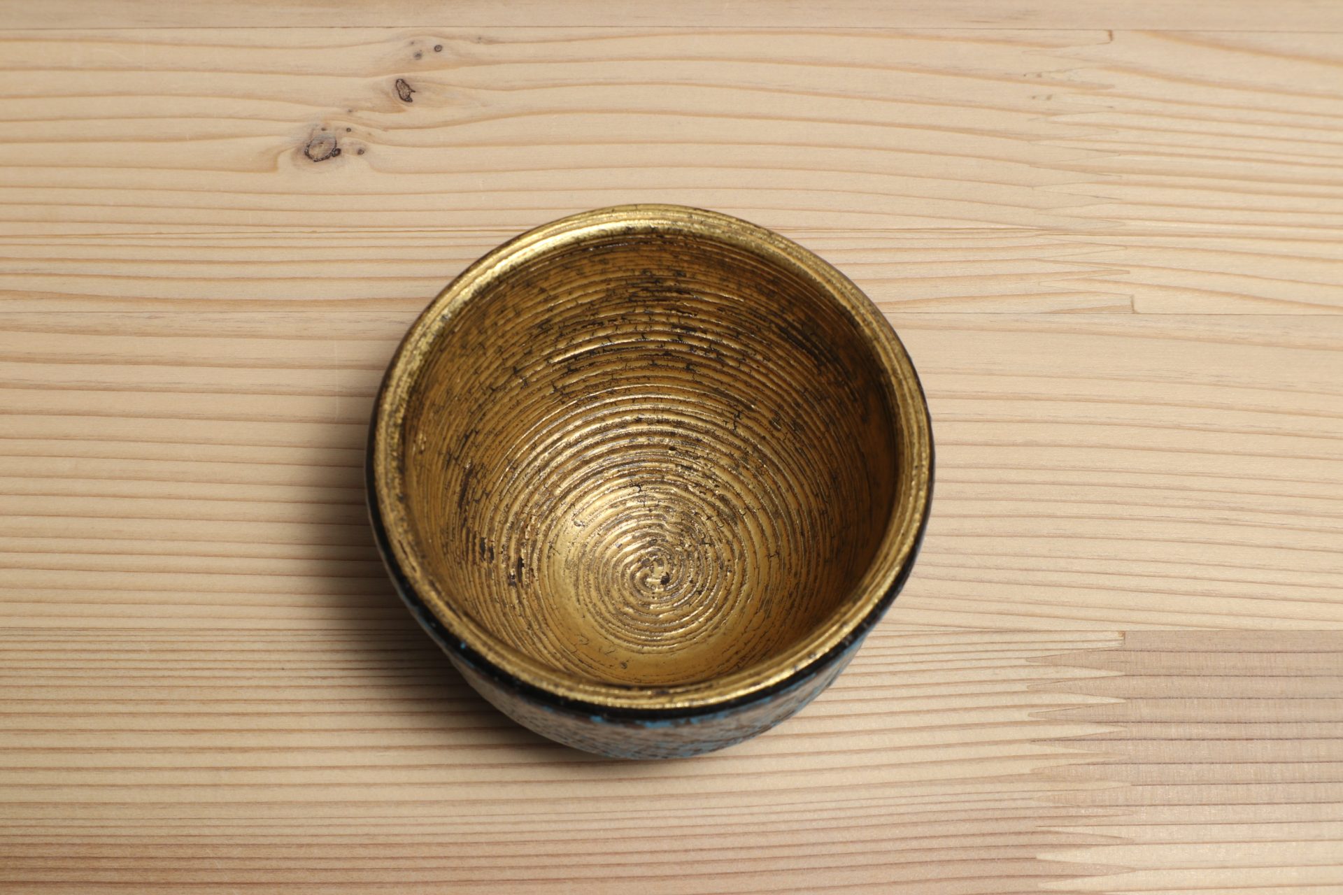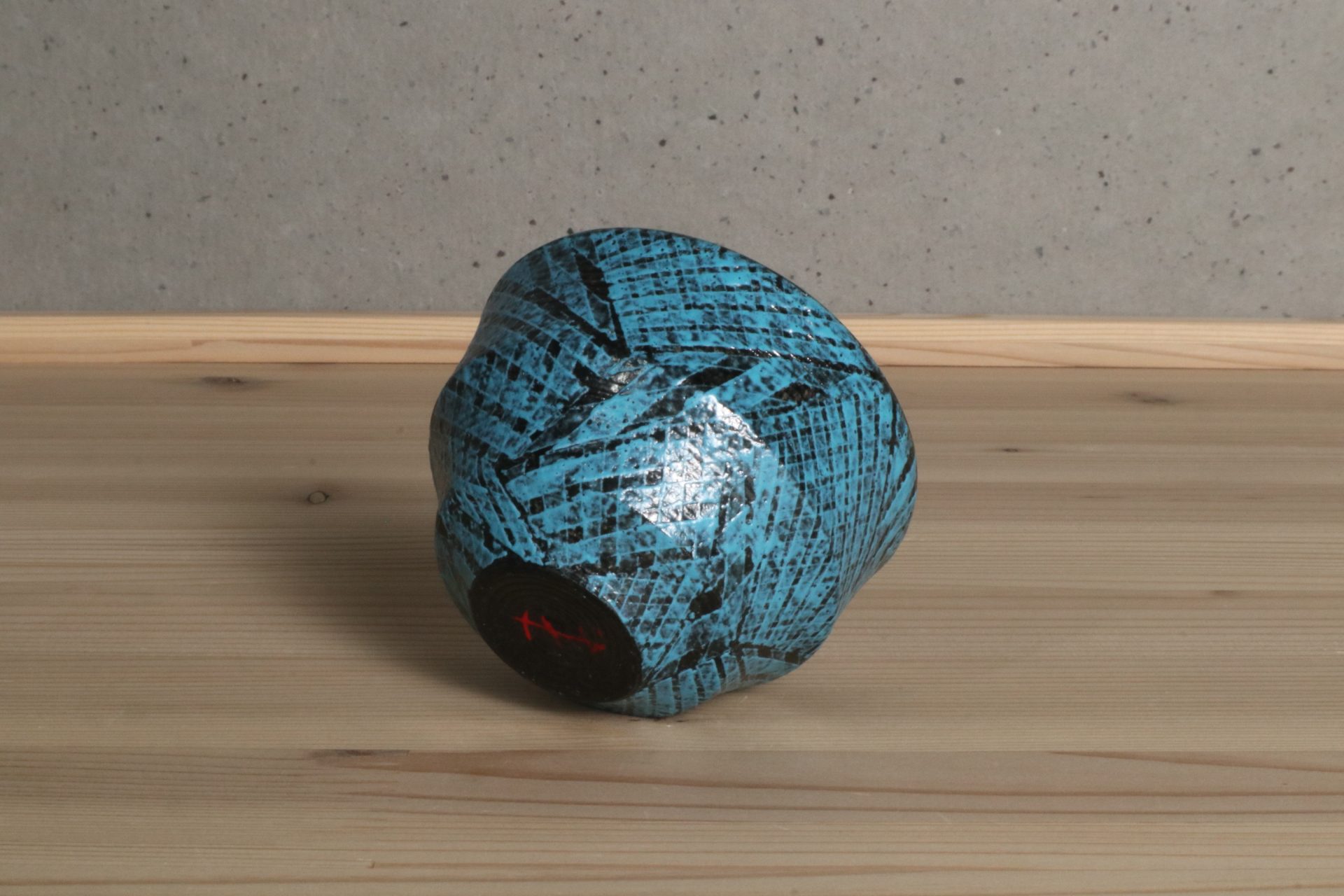前田正博さんの白磁をキャンバスに市松文様をモチーフとしたぐい呑。マスキングにより何度も色を塗り重ねて焼成を繰り返すことで、黒とブルーがポップで枯せた意匠に。見込みは黒と金の根来風の仕上げになっています。