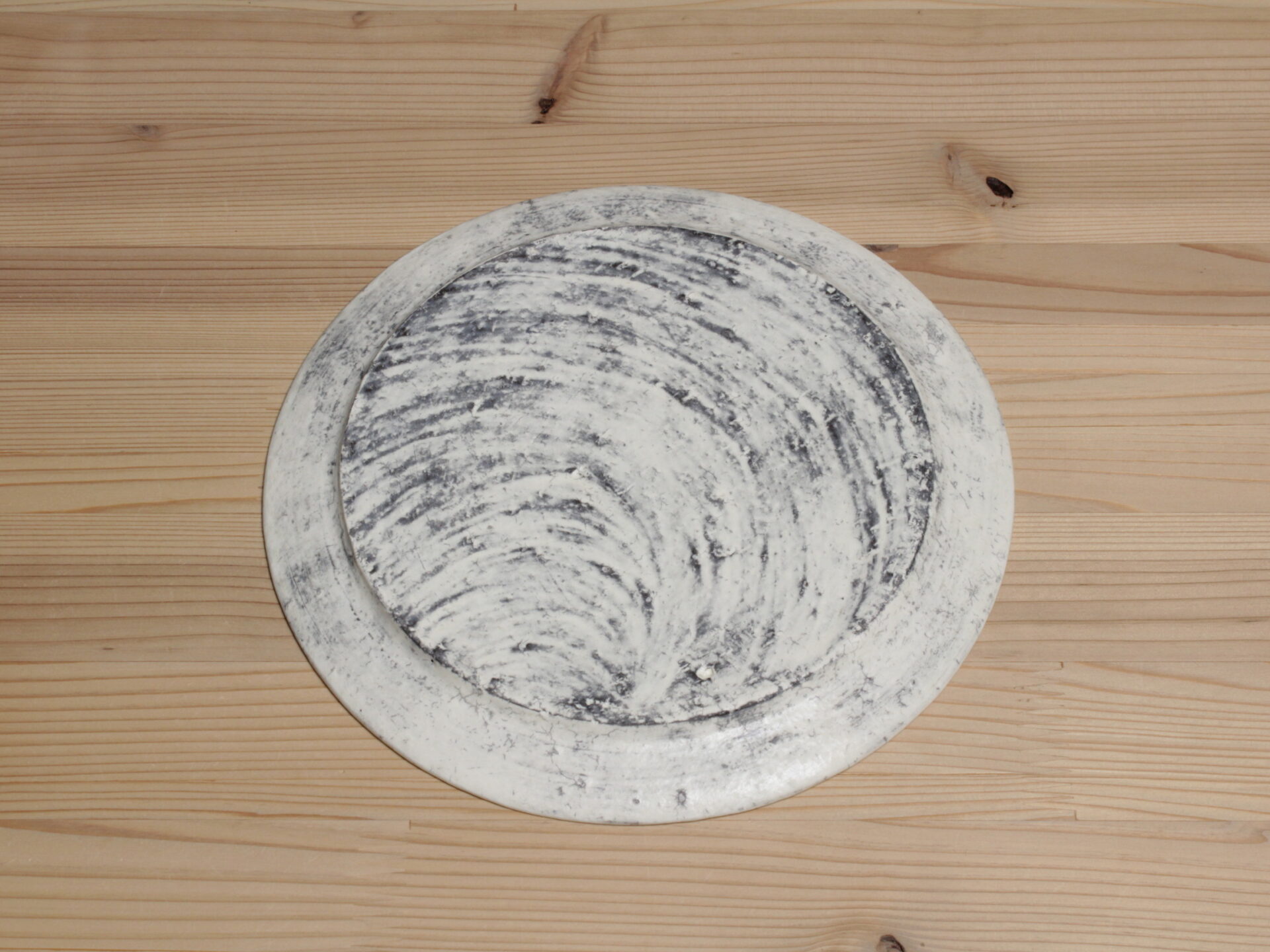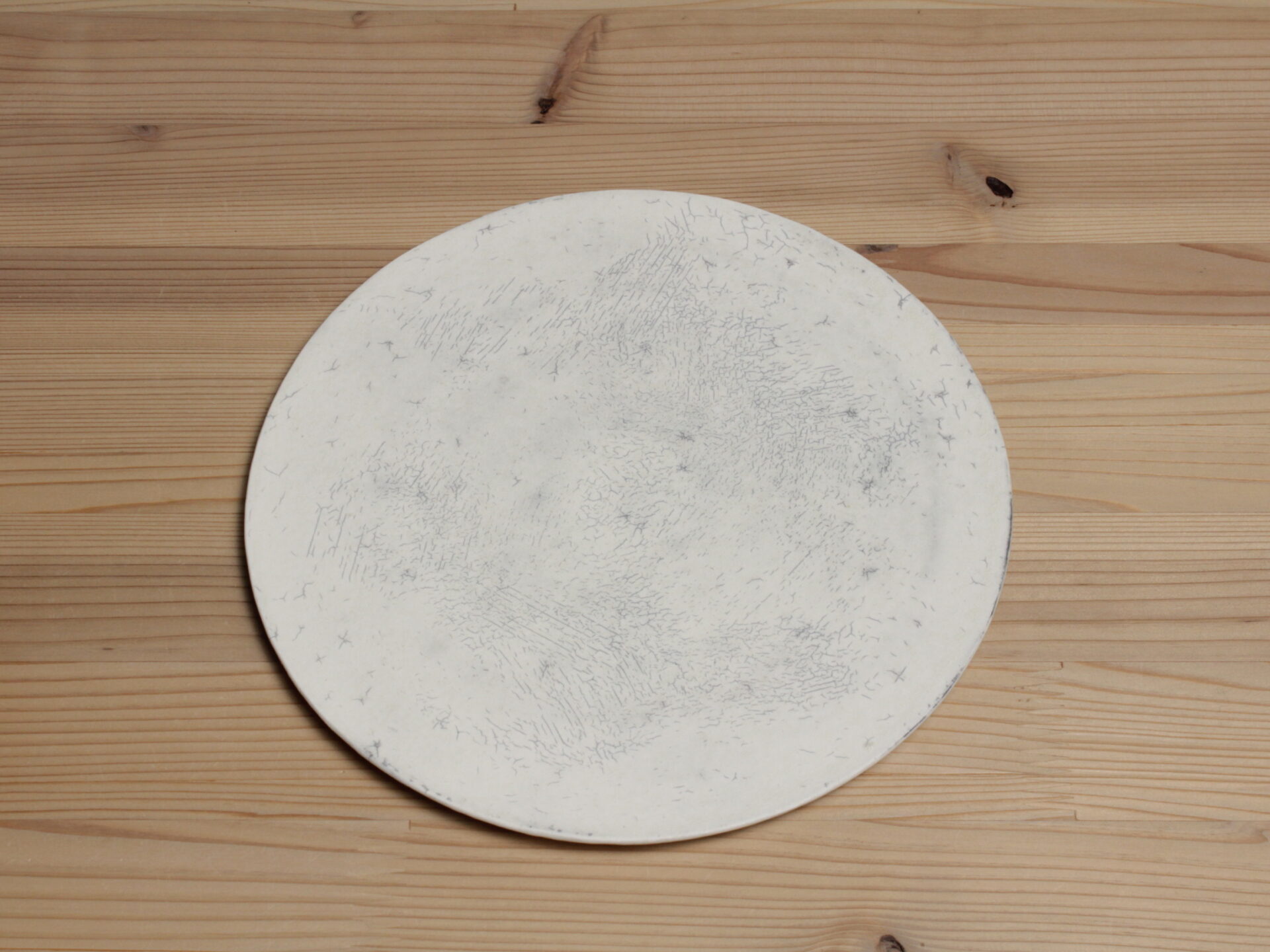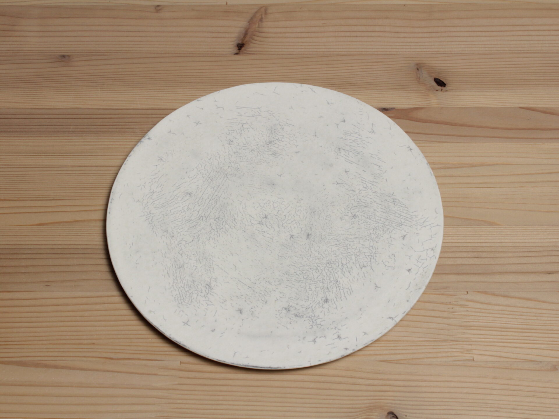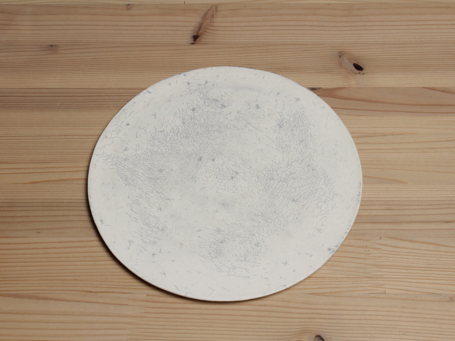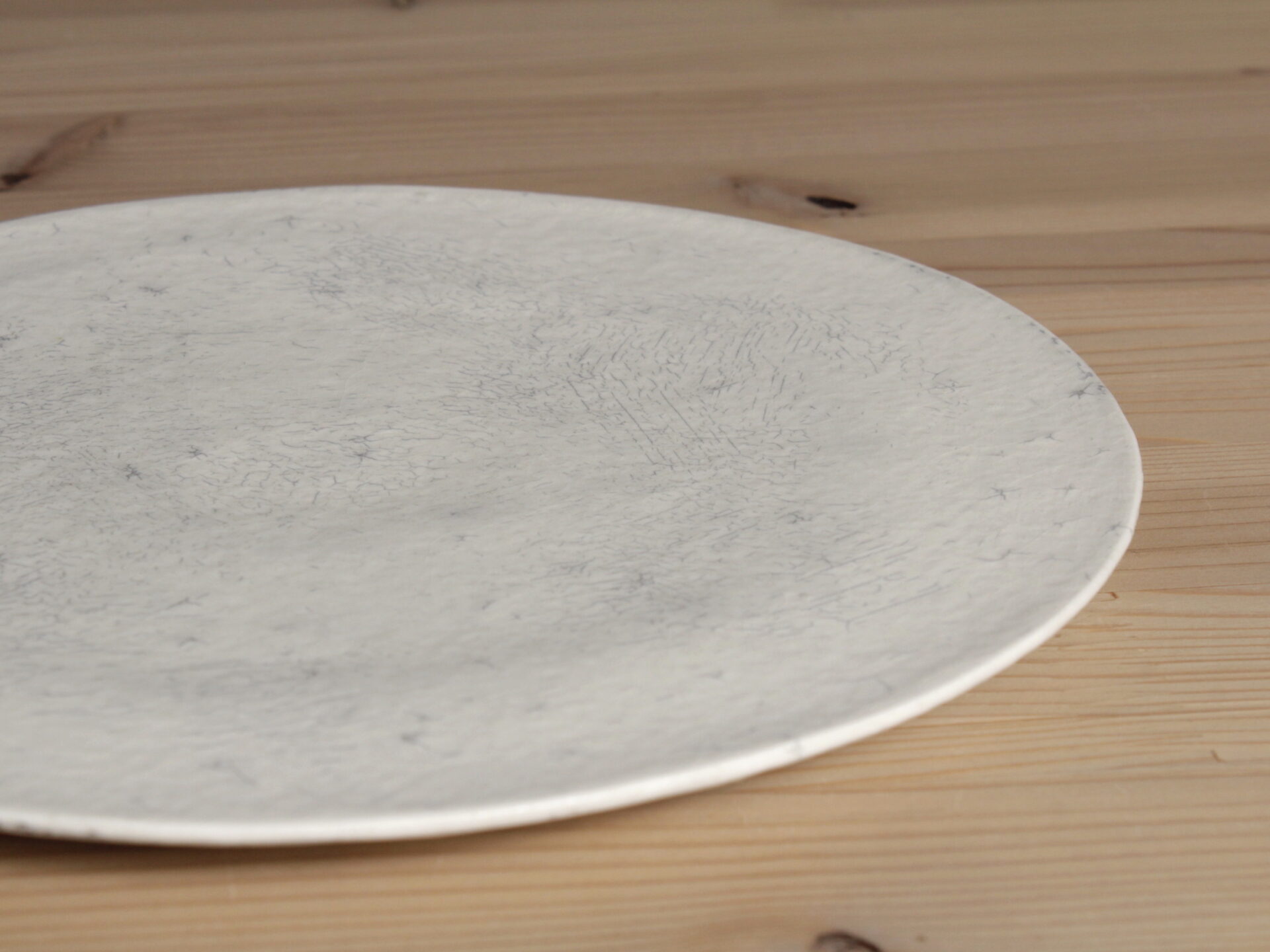 横山拓也さんの白七寸フラット皿です。スタイリッシュな雰囲気の円盤形のフラットな丸皿。侘びた風情の土肌は、何度も化粧土を叩き付けることで土壁のような風韻となっています。いわゆる「粉引」作品ですので、使い込むほどに雨漏りのようなシミが育まれて、素朴な表情に変化してきます。