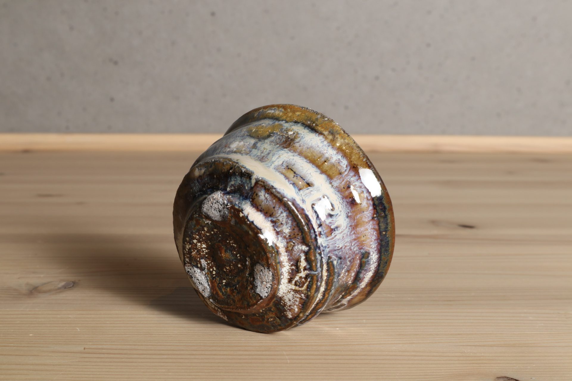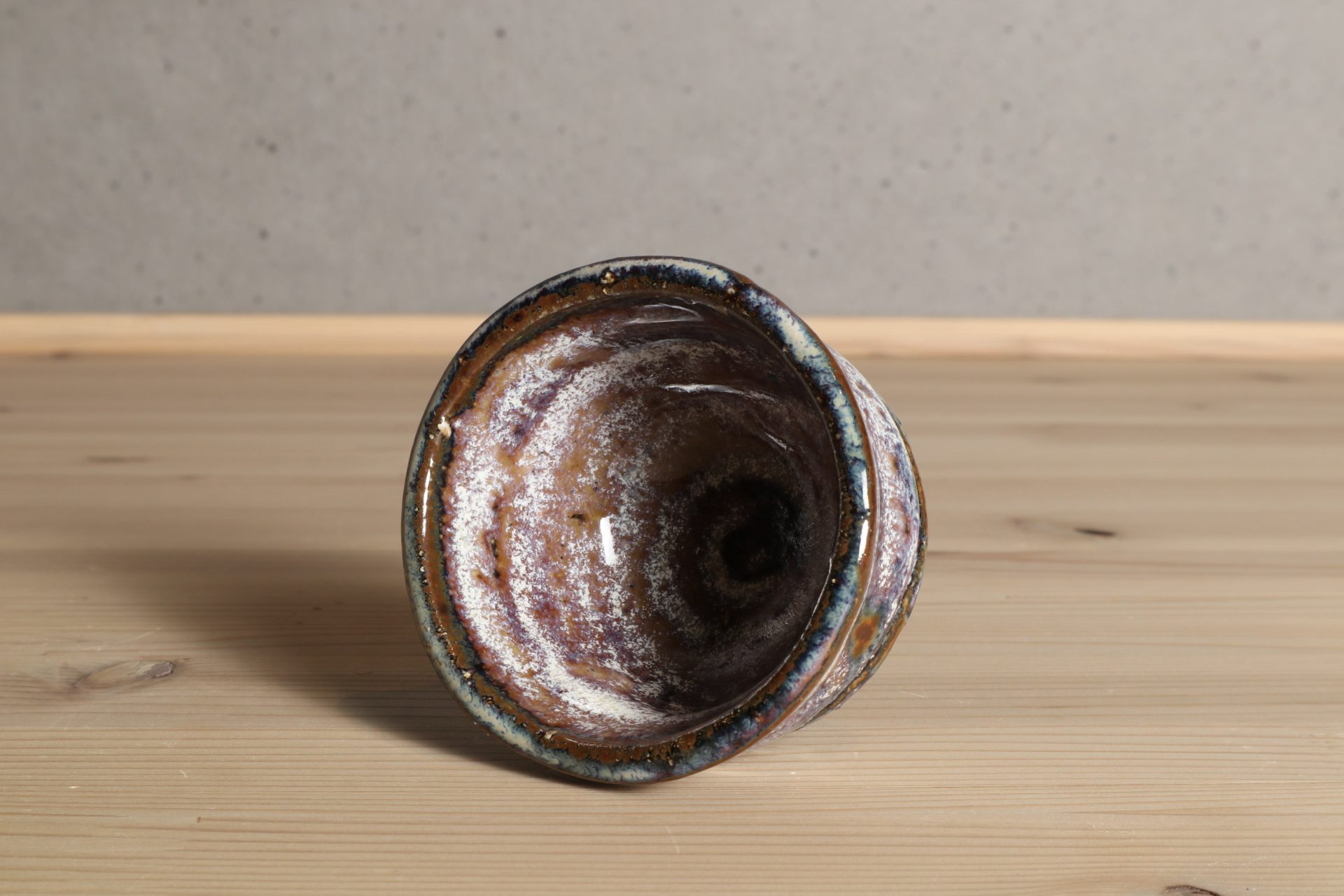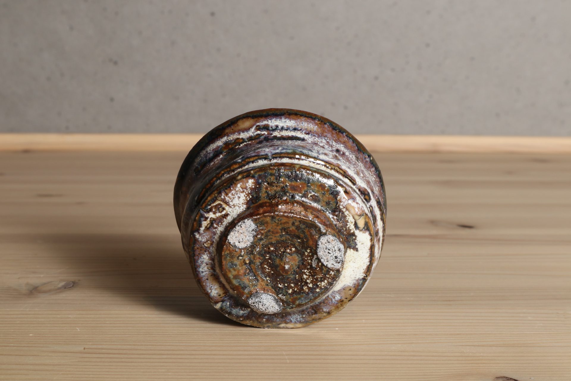 浜田敦士さんの窯変粉引ぐい吞です。小気味よい轆轤のぼってりとした半筒のフォルム。美しい窯変が魅惑的な表情となっています。