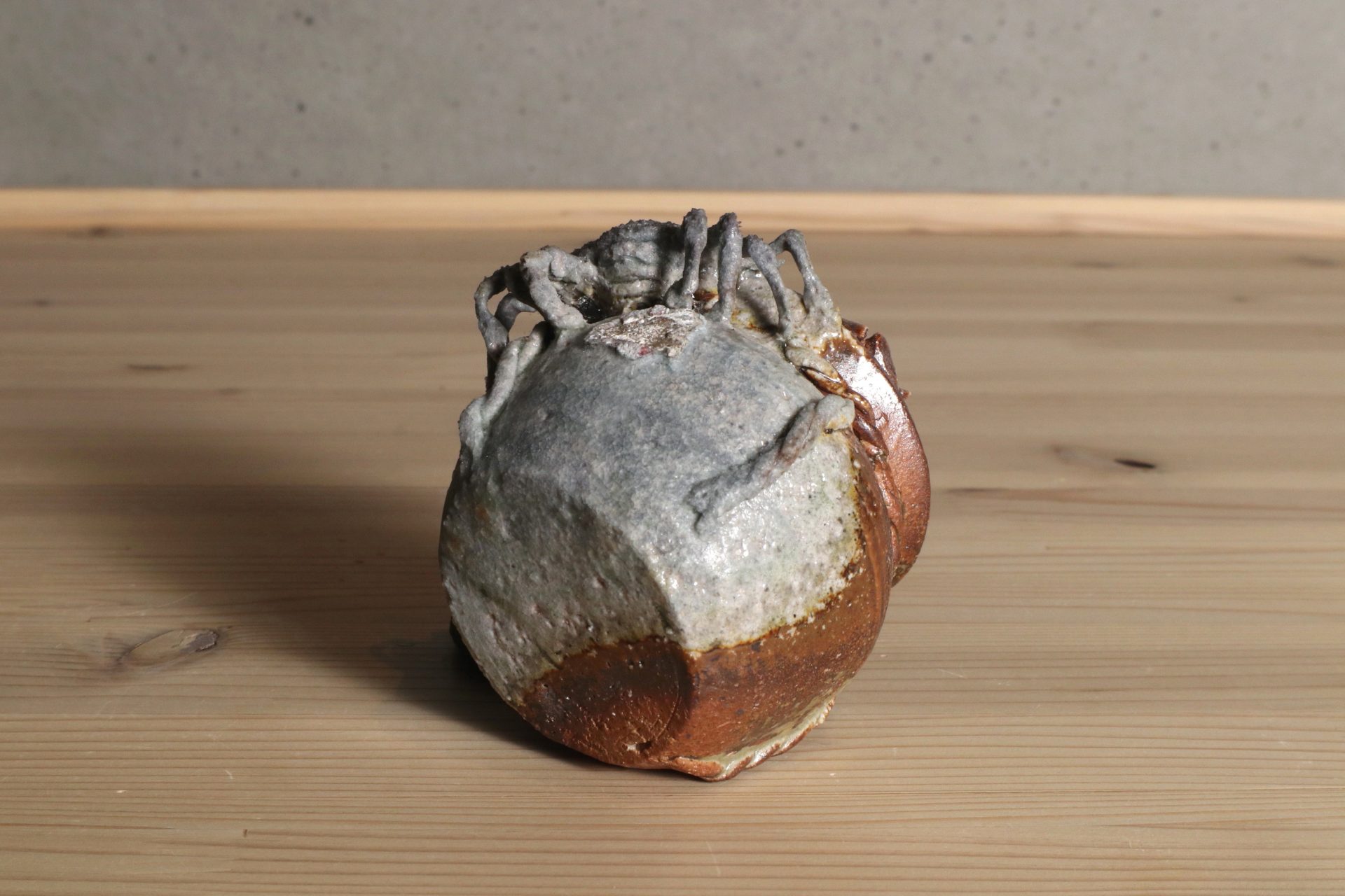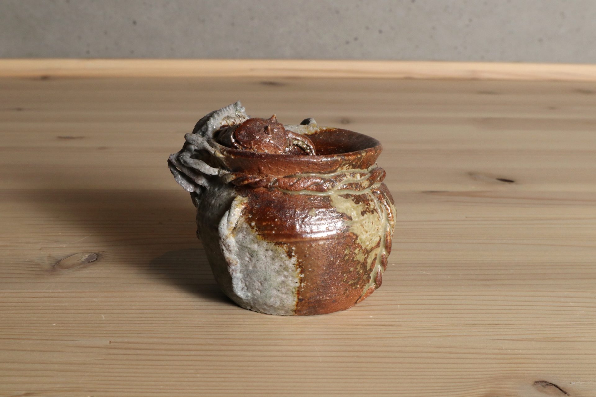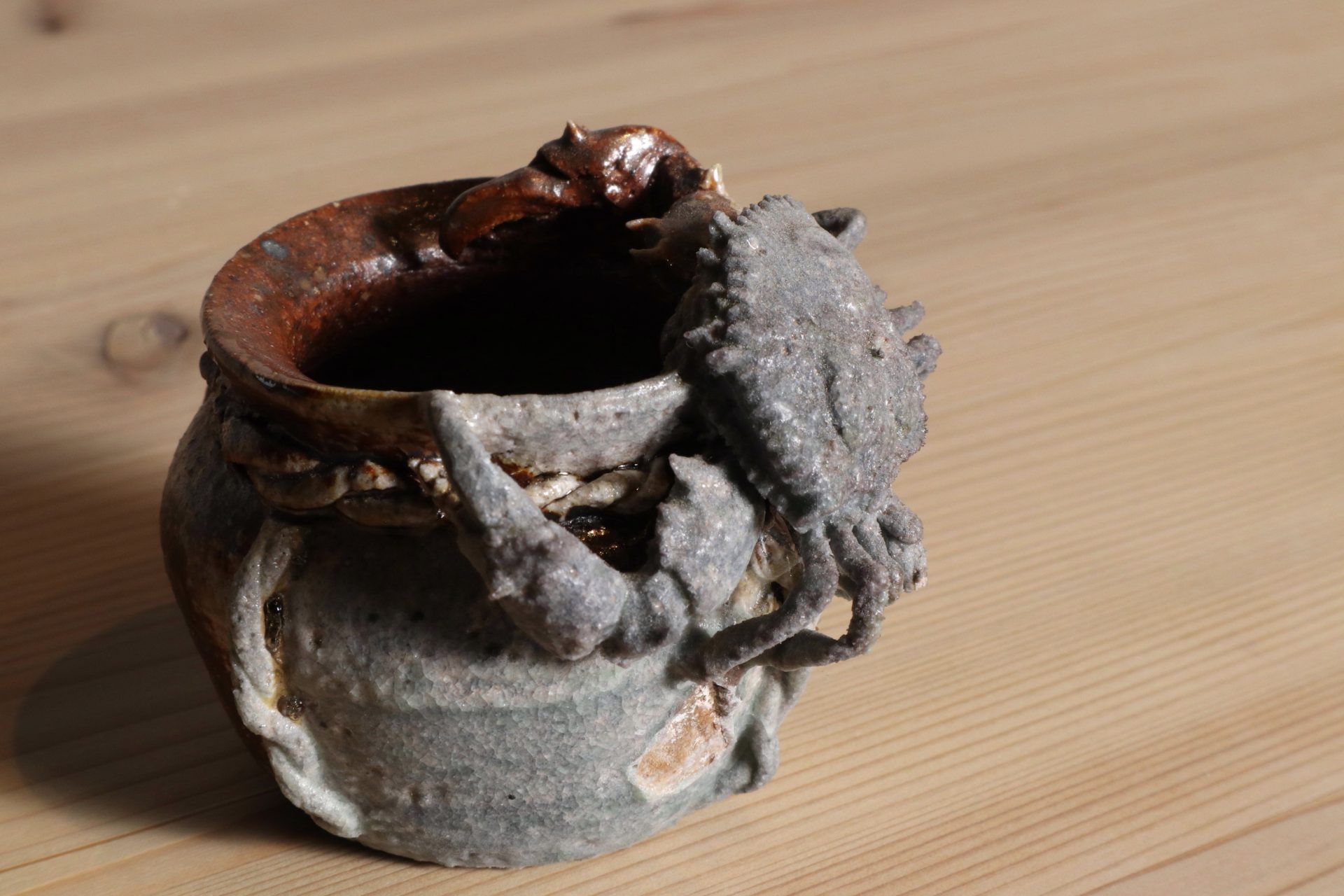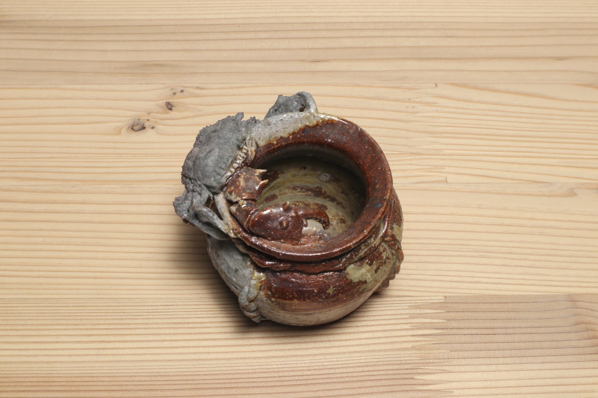 浜田敦士さんの焼〆蟹壺形酒呑です。タコ壺ならぬカニ壺をモチーフにしたぐい吞。穴窯でじっくり焼成され野性味ある灰被が迫力ある表情です。