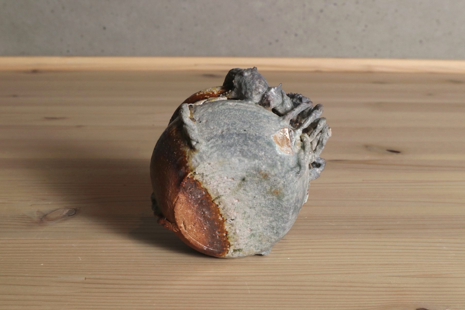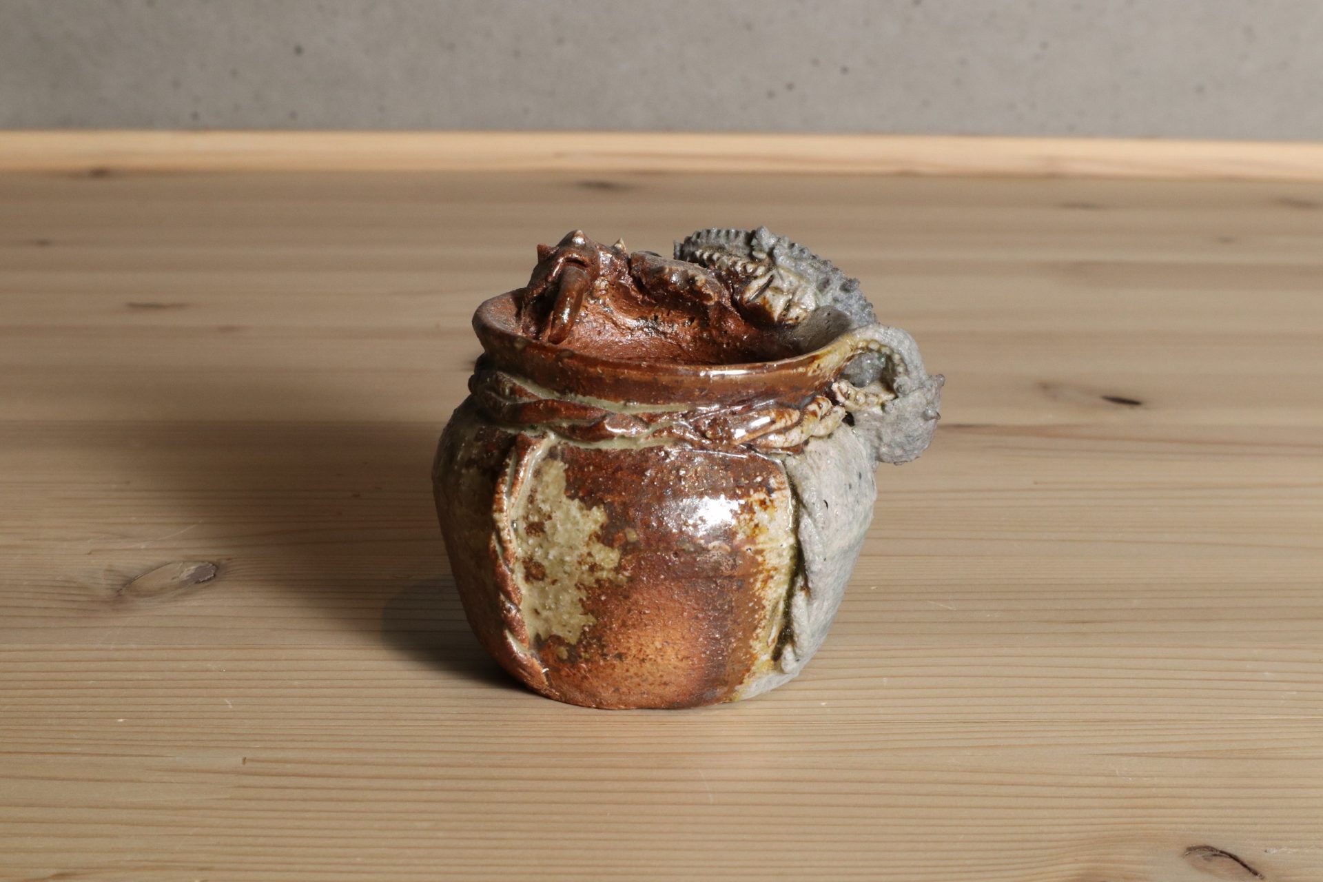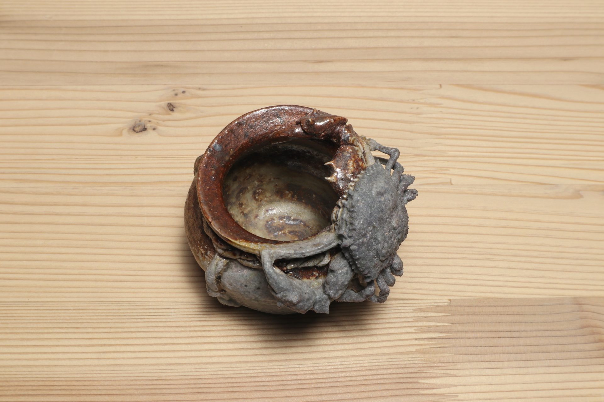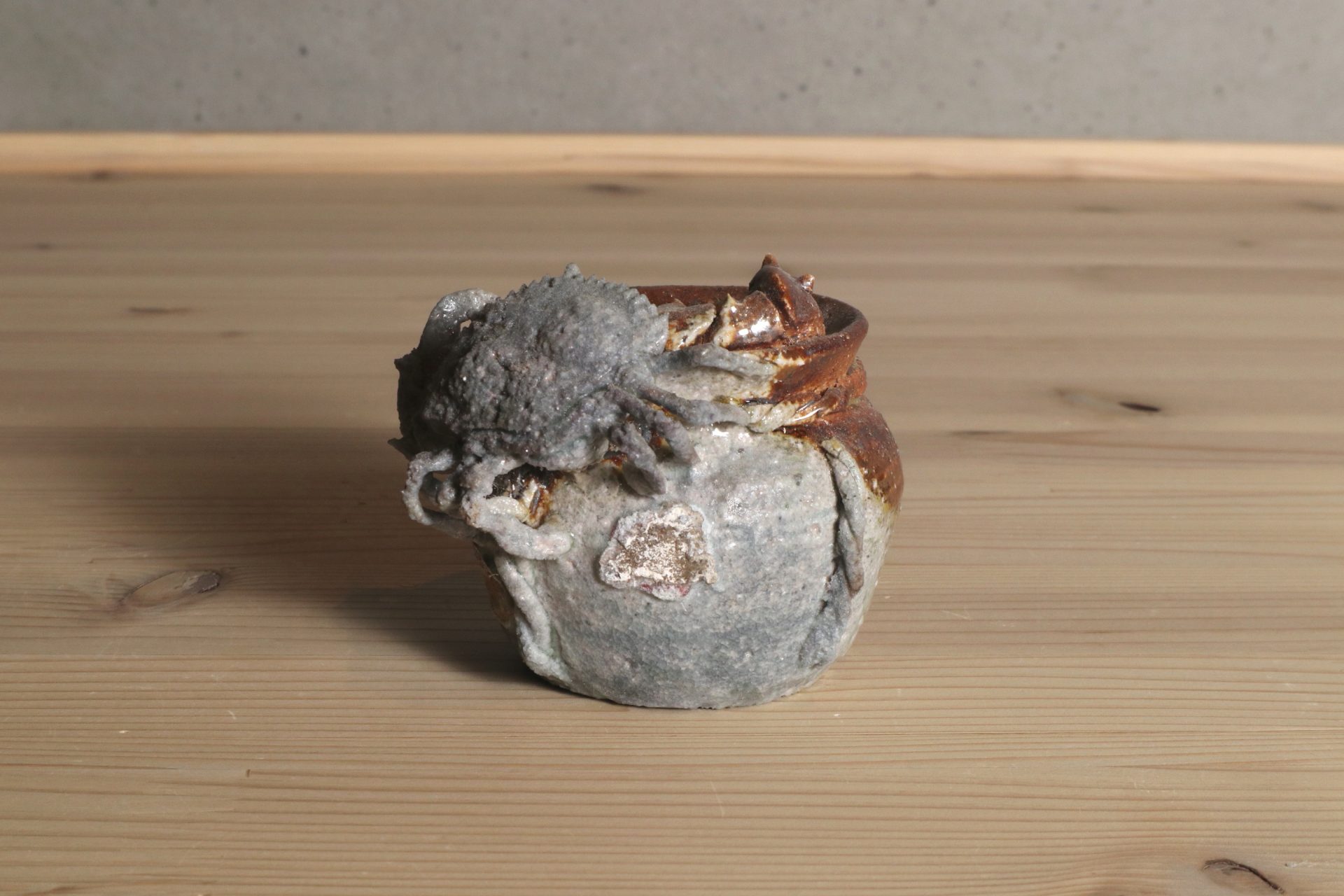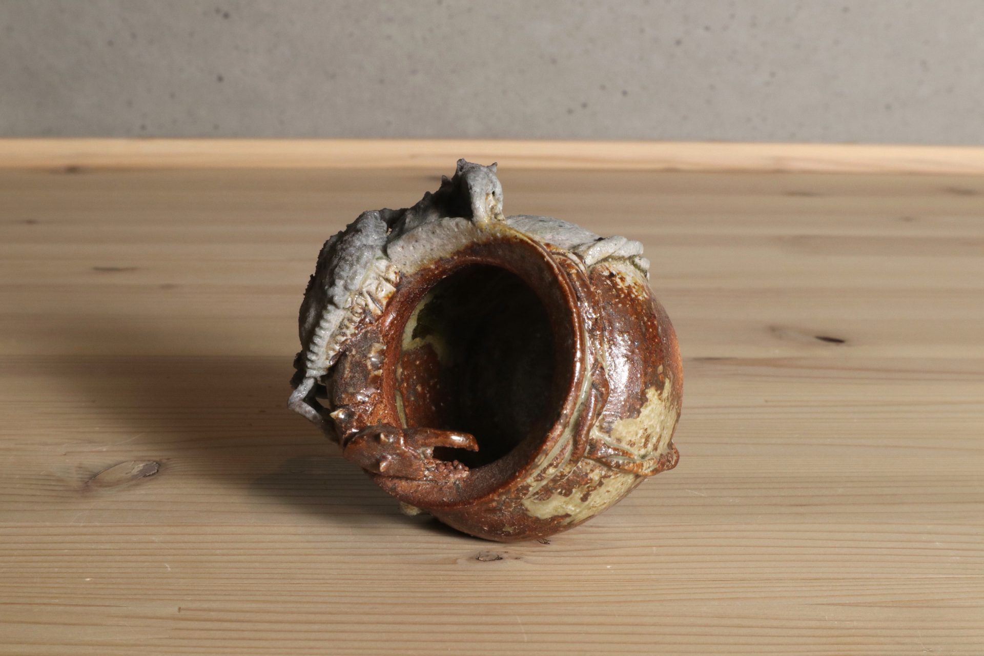 浜田敦士さんの焼〆蟹壺形酒呑です。タコ壺ならぬカニ壺をモチーフにしたぐい吞。穴窯でじっくり焼成され野性味ある灰被が迫力ある表情です。