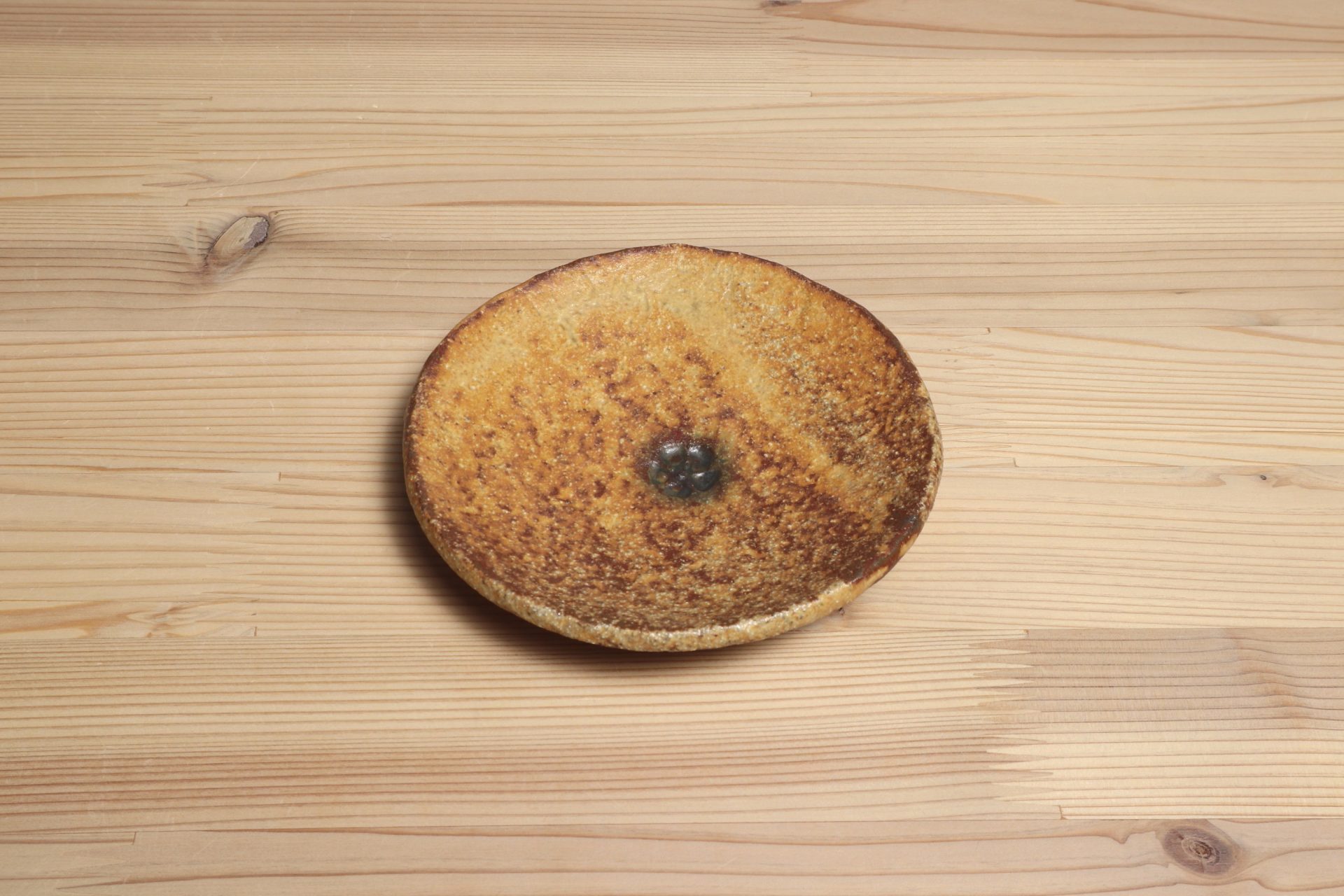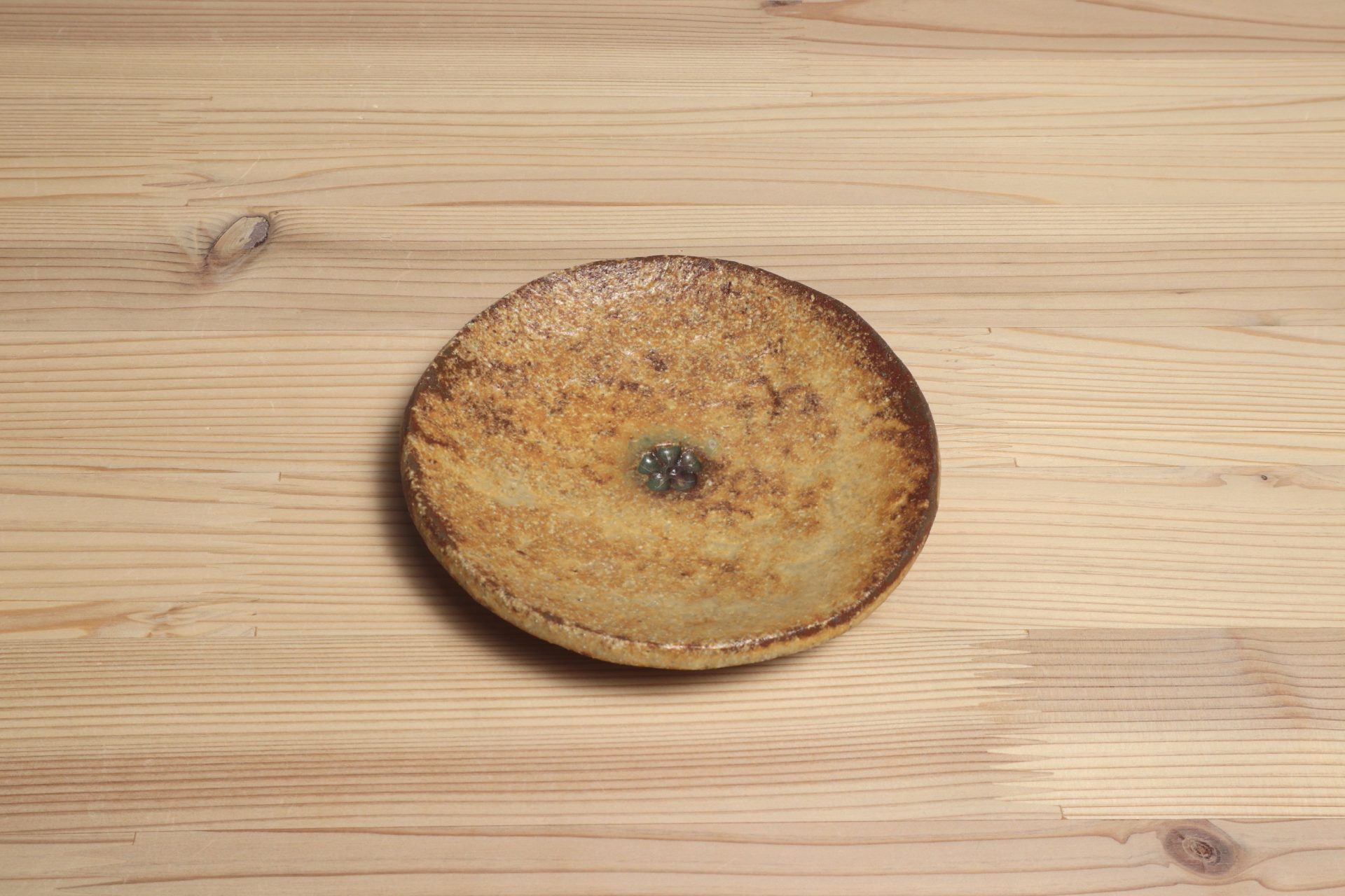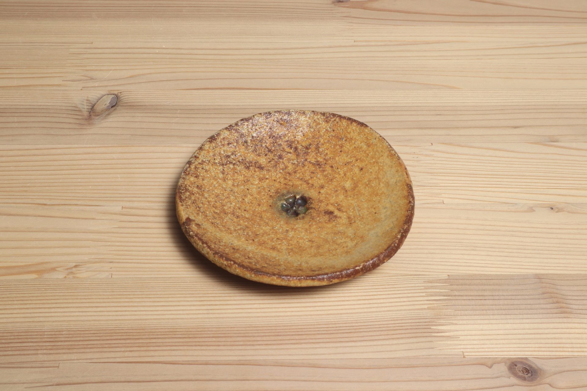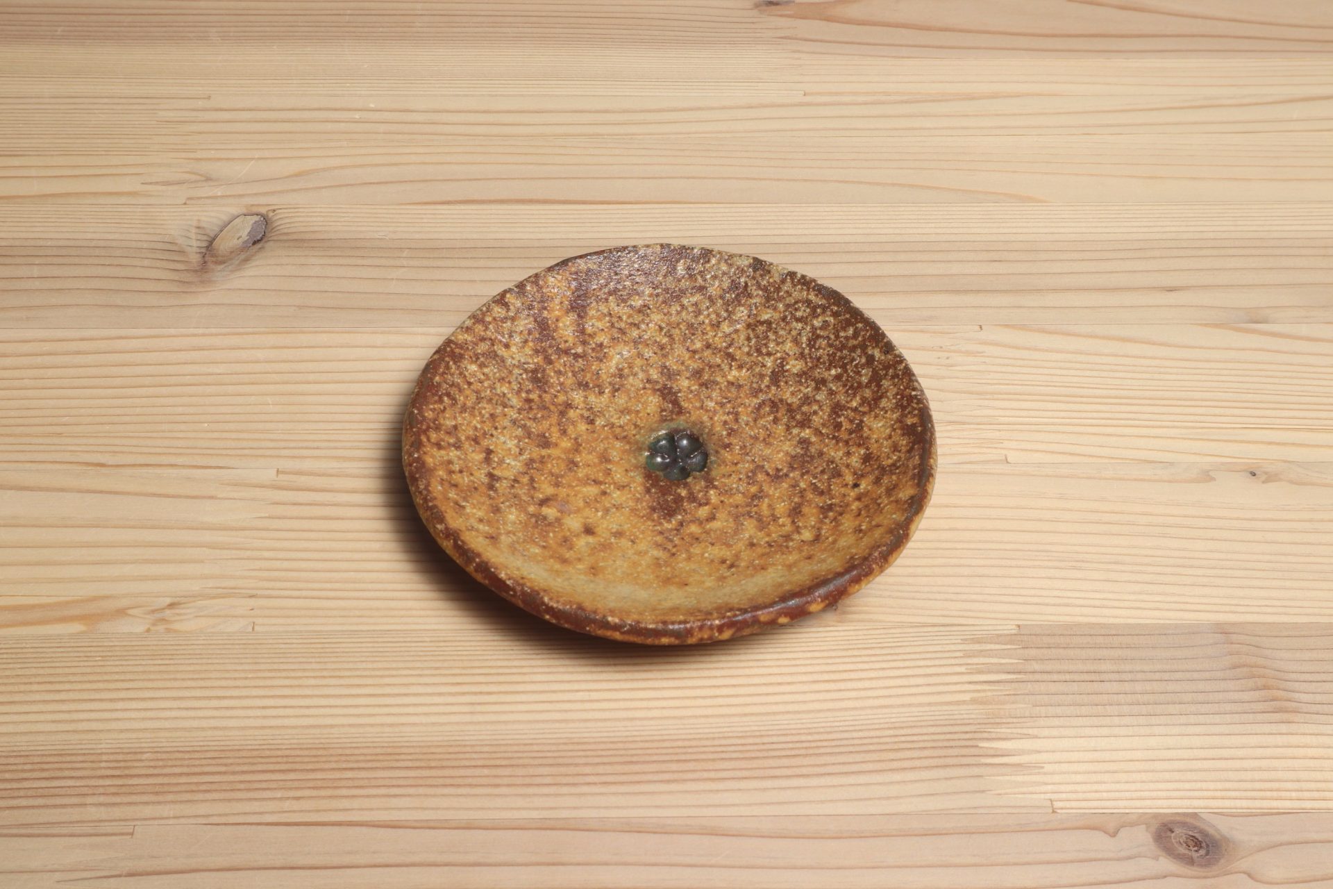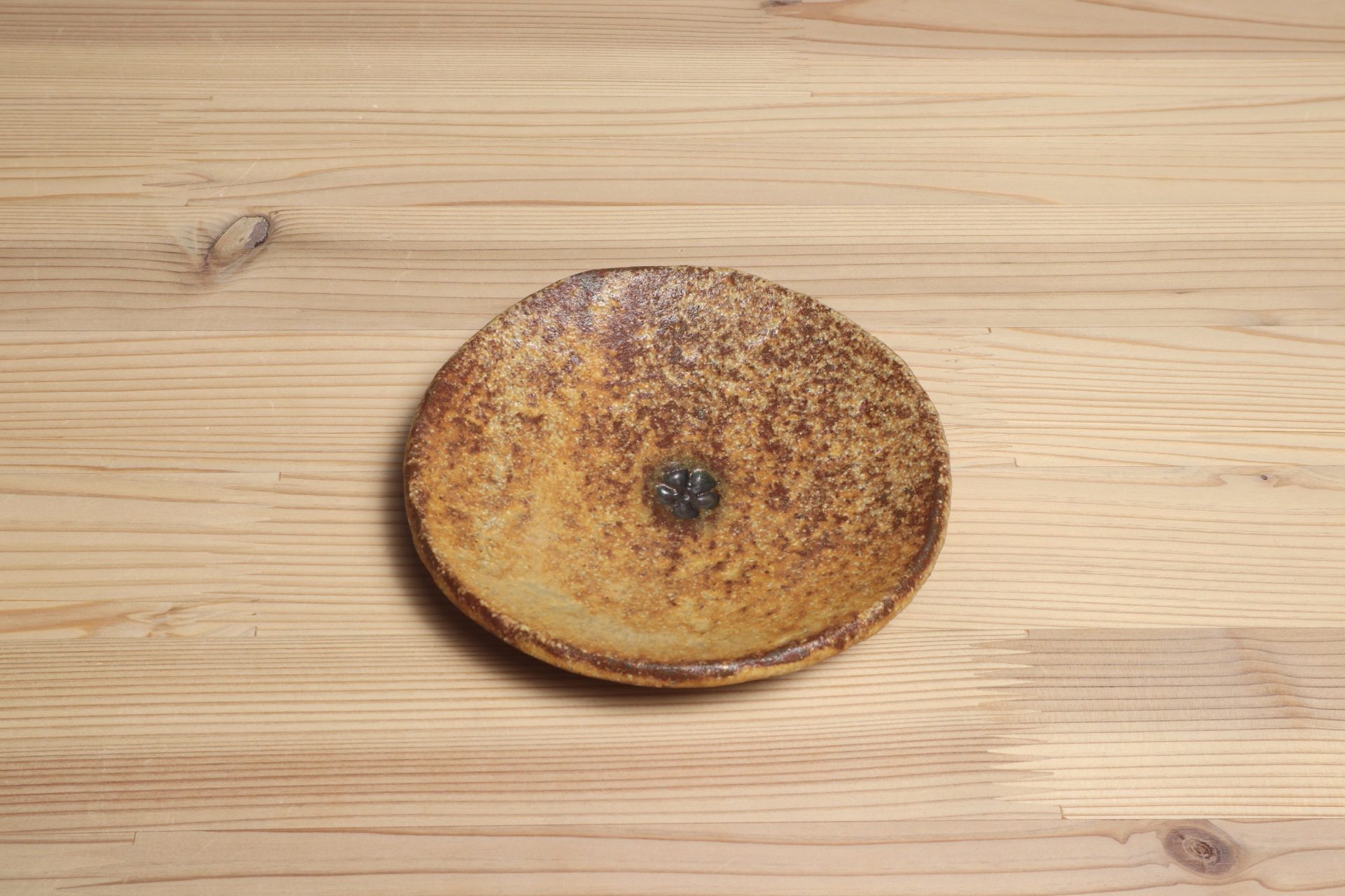 浜田敦士さんの黄瀬戸四寸丸皿です。黄金色に焼きあがったお煎餅のような黄瀬戸丸皿。しっとりと枯せた風韻の釉調に、菊花印とタンパンがアクセントに。愛らしい三つ足に、作家の心遣いを感じます。在庫は10客。