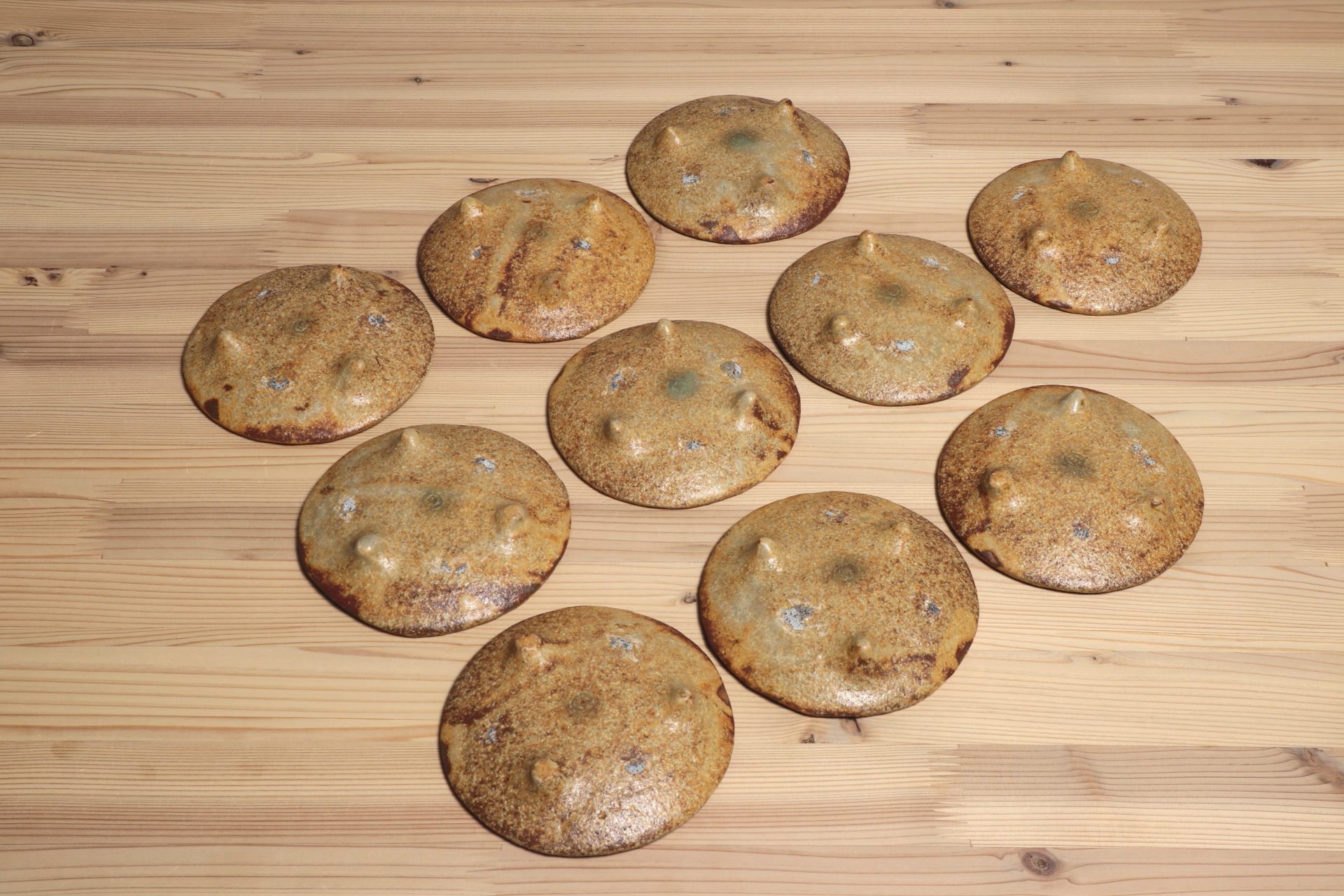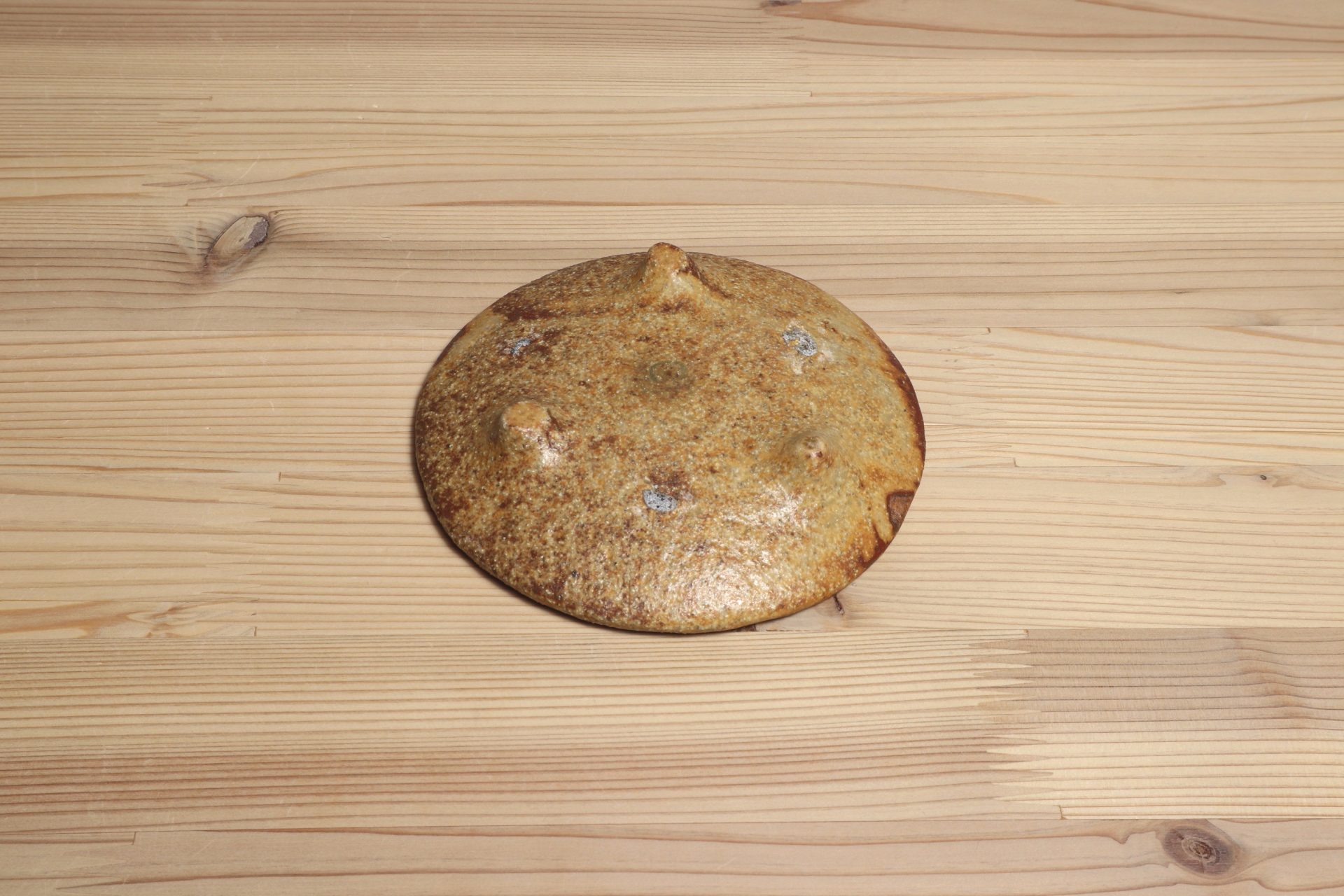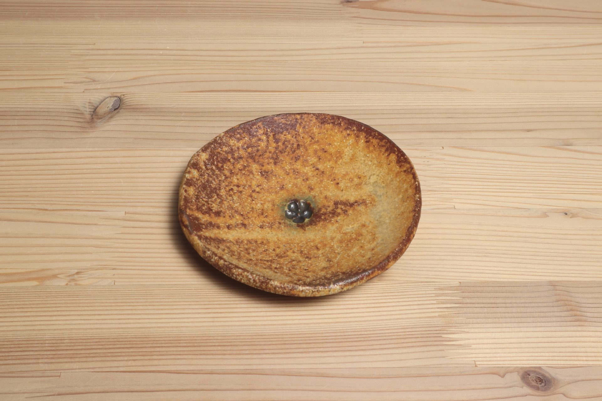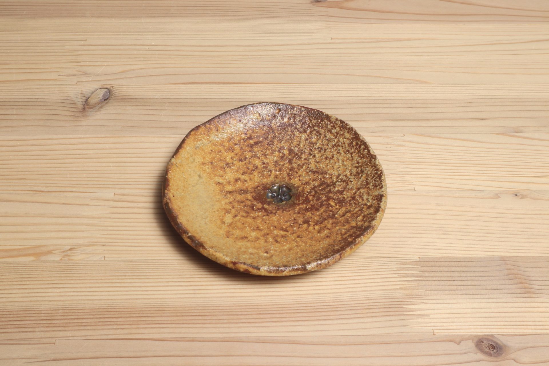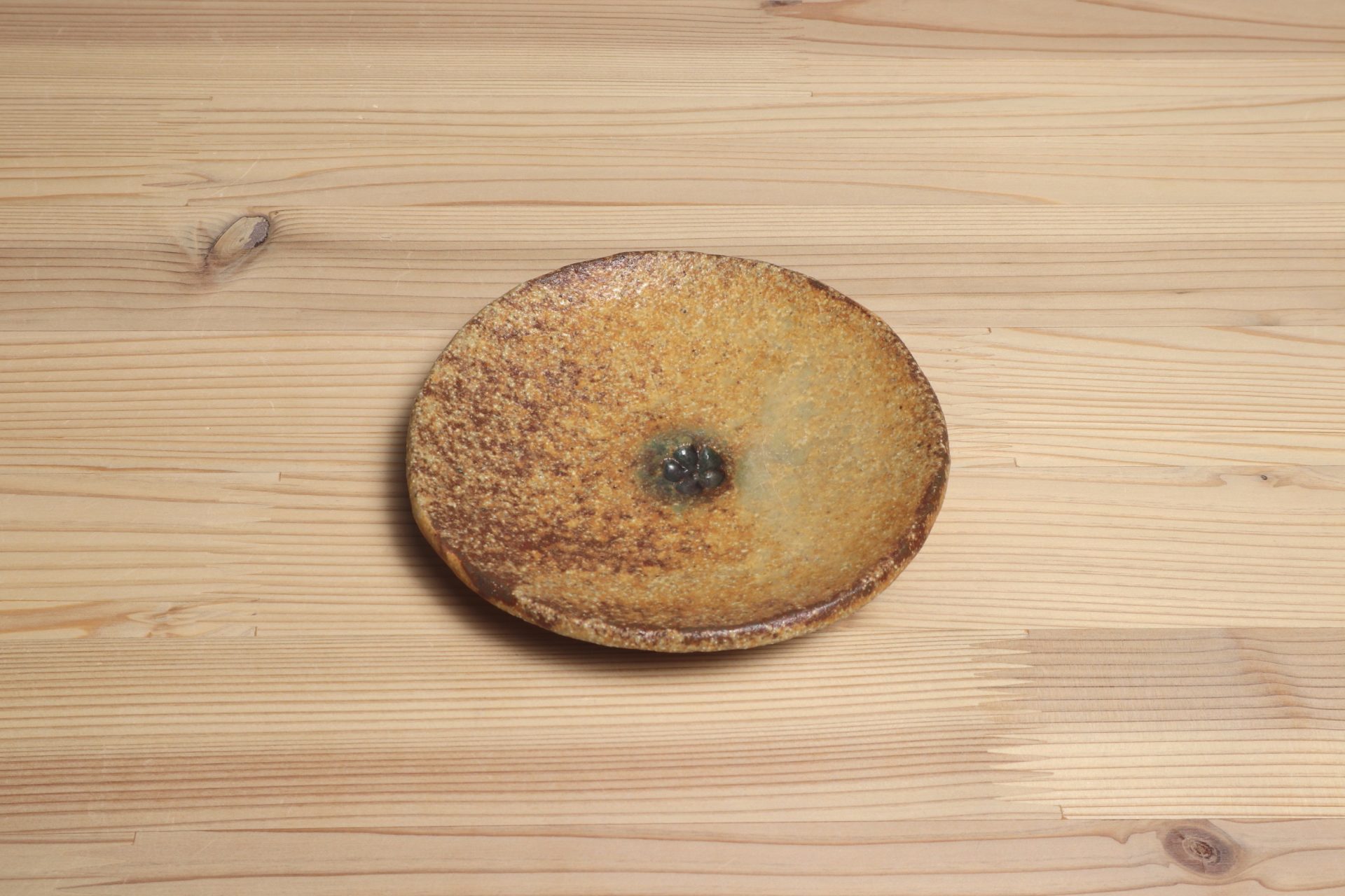 浜田敦士さんの黄瀬戸四寸丸皿です。黄金色に焼きあがったお煎餅のような黄瀬戸丸皿。しっとりと枯せた風韻の釉調に、菊花印とタンパンがアクセントに。愛らしい三つ足に、作家の心遣いを感じます。在庫は10客。