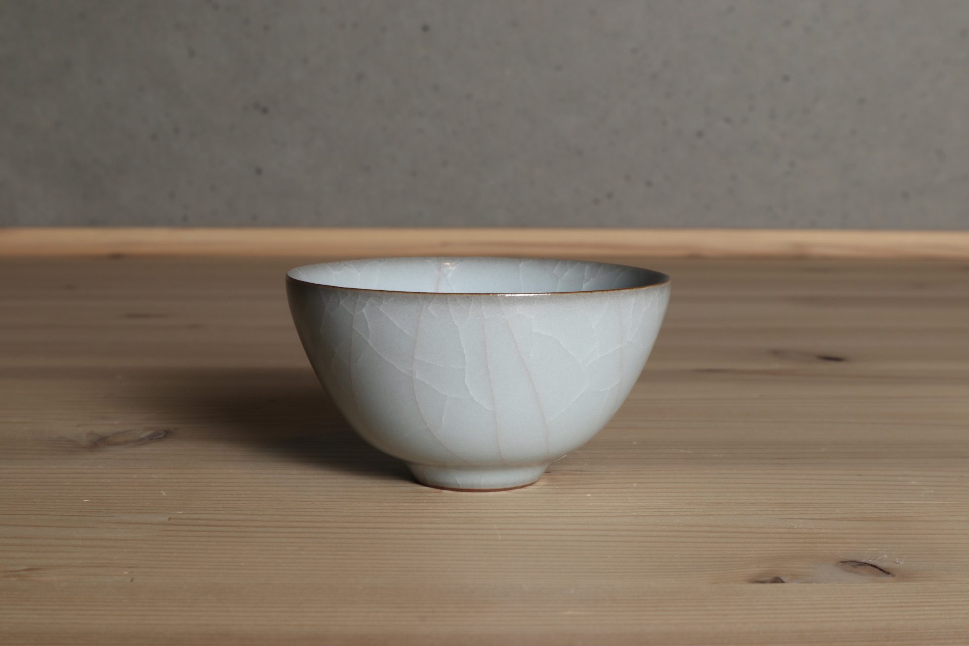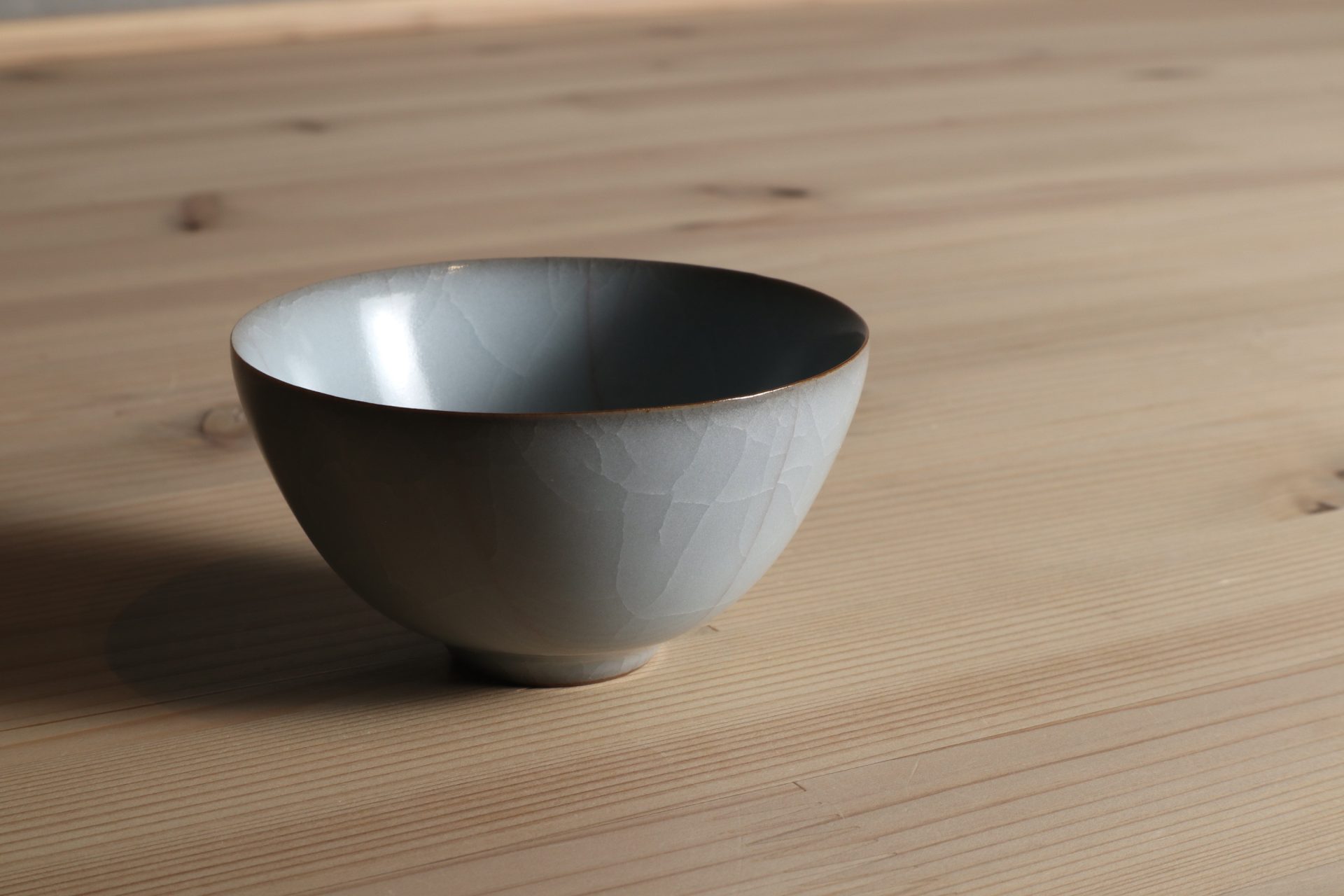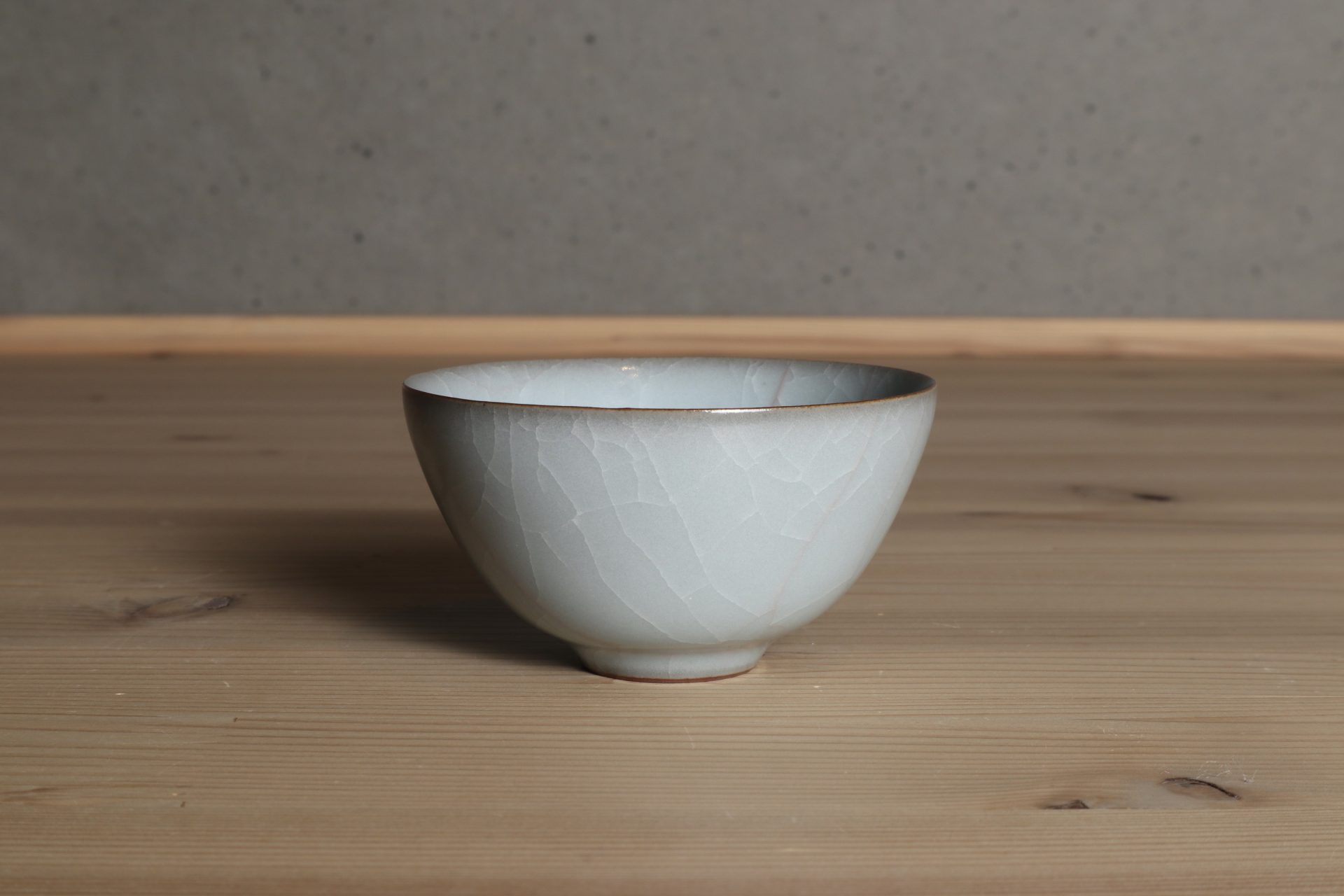 志賀暁吉さんの青瓷ぐい呑です。繊細な口造りのたっぷりとした碗形が美しいフォルム。やや失透した青瓷釉はしっとりと憂いを帯びた色調となっています、弁柄で染められた貫入と無色の貫入が織り成す表情。端正で美しい酒盃です。