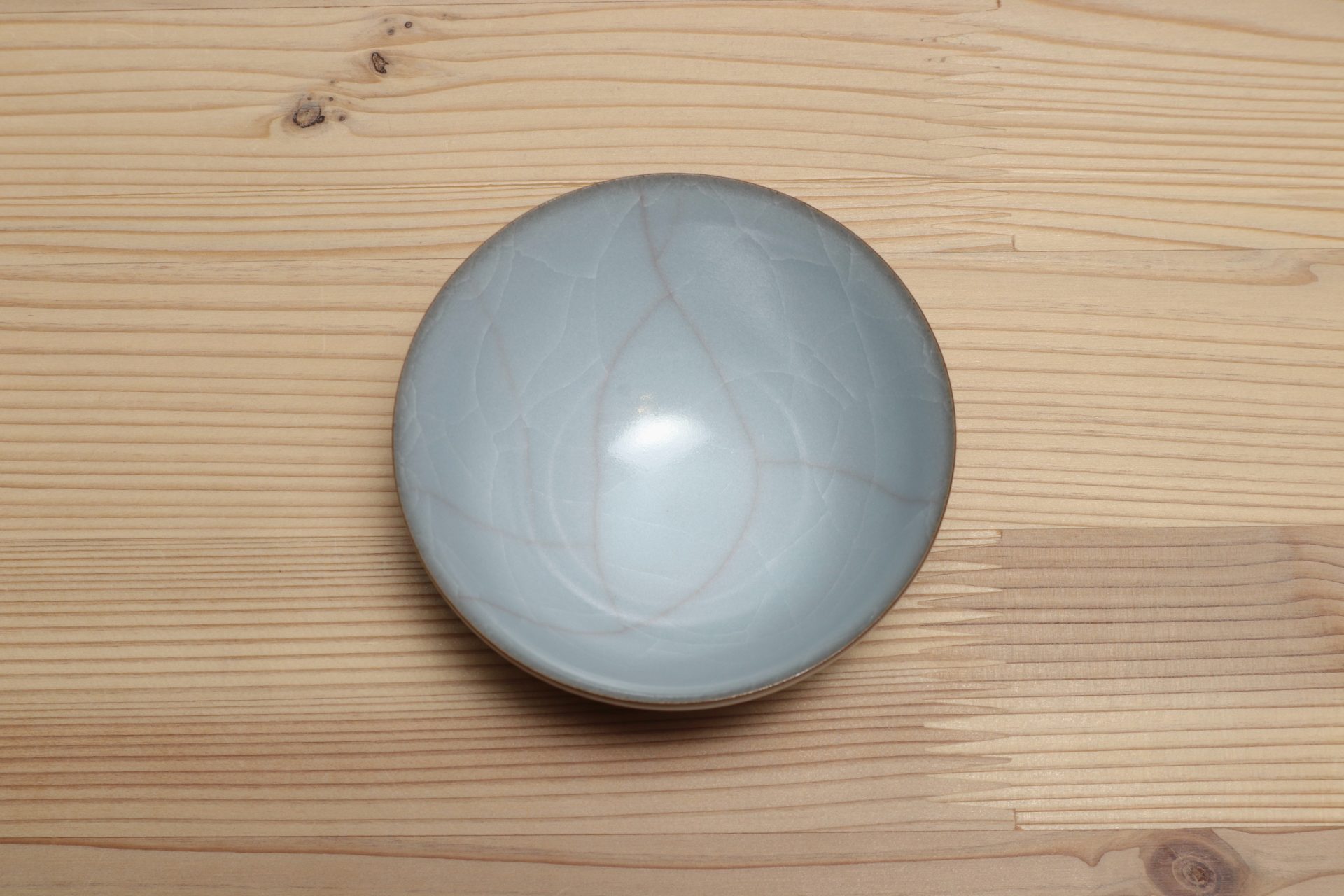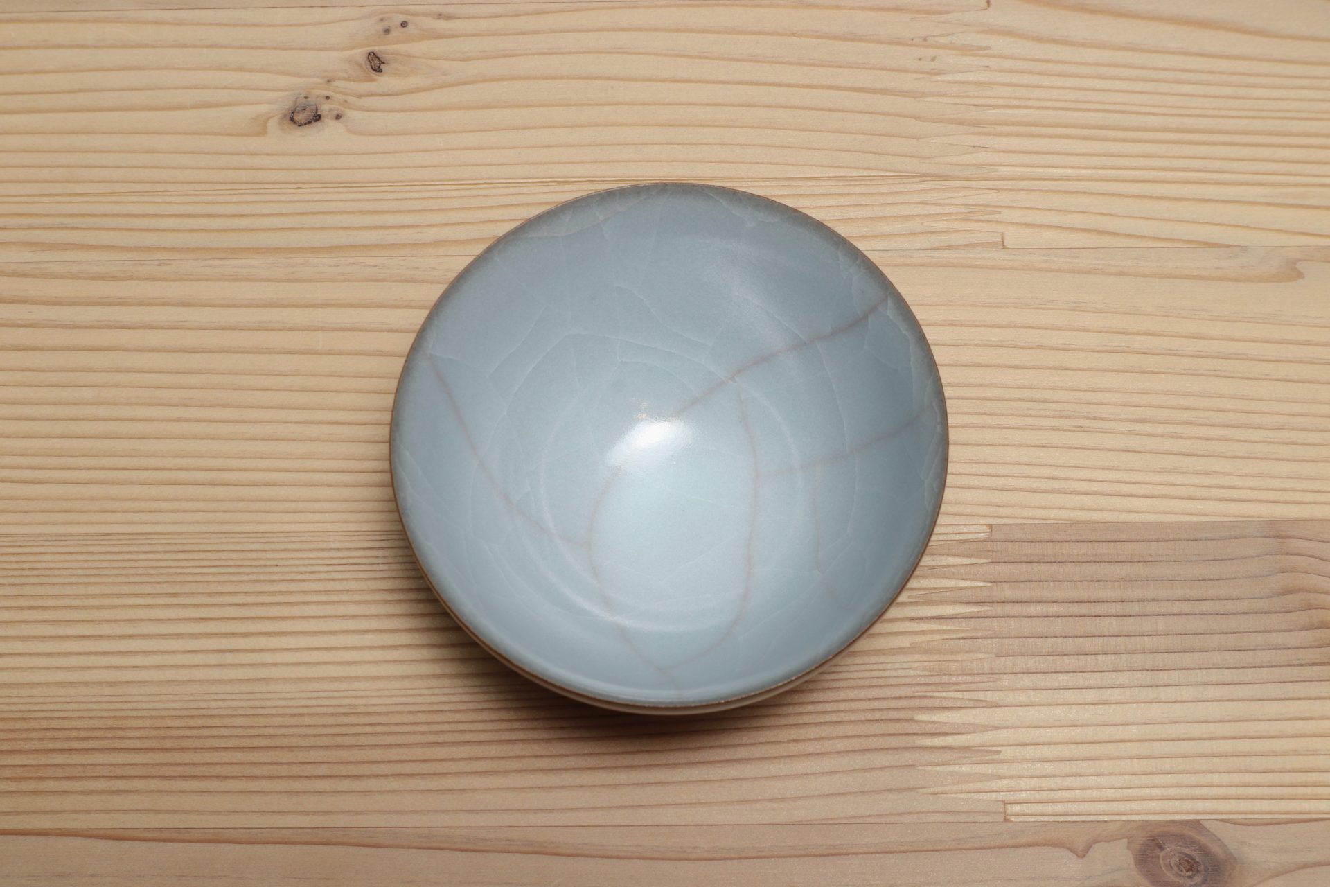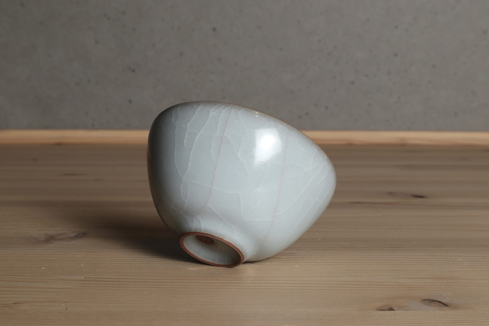 志賀暁吉さんの青瓷ぐい呑です。繊細な口造りのたっぷりとした碗形が美しいフォルム。やや失透した青瓷釉はしっとりと憂いを帯びた色調となっています、弁柄で染められた貫入と無色の貫入が織り成す表情。端正で美しい酒盃です。