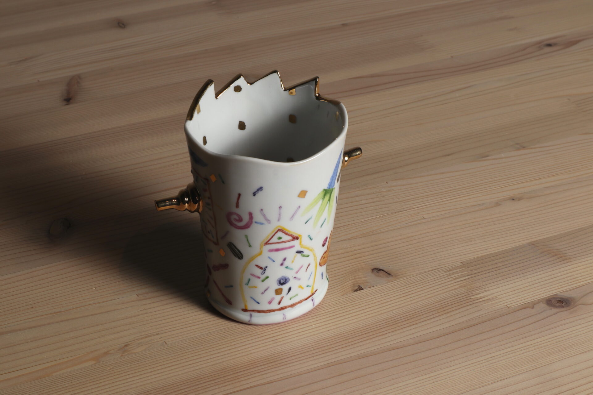 川口淳さんの色絵金彩楽園紋カップです。おもちゃ箱をひっくり返したような、ポップで愛らしい絵付け。そこに在るだけで、とても楽しくなる器です。