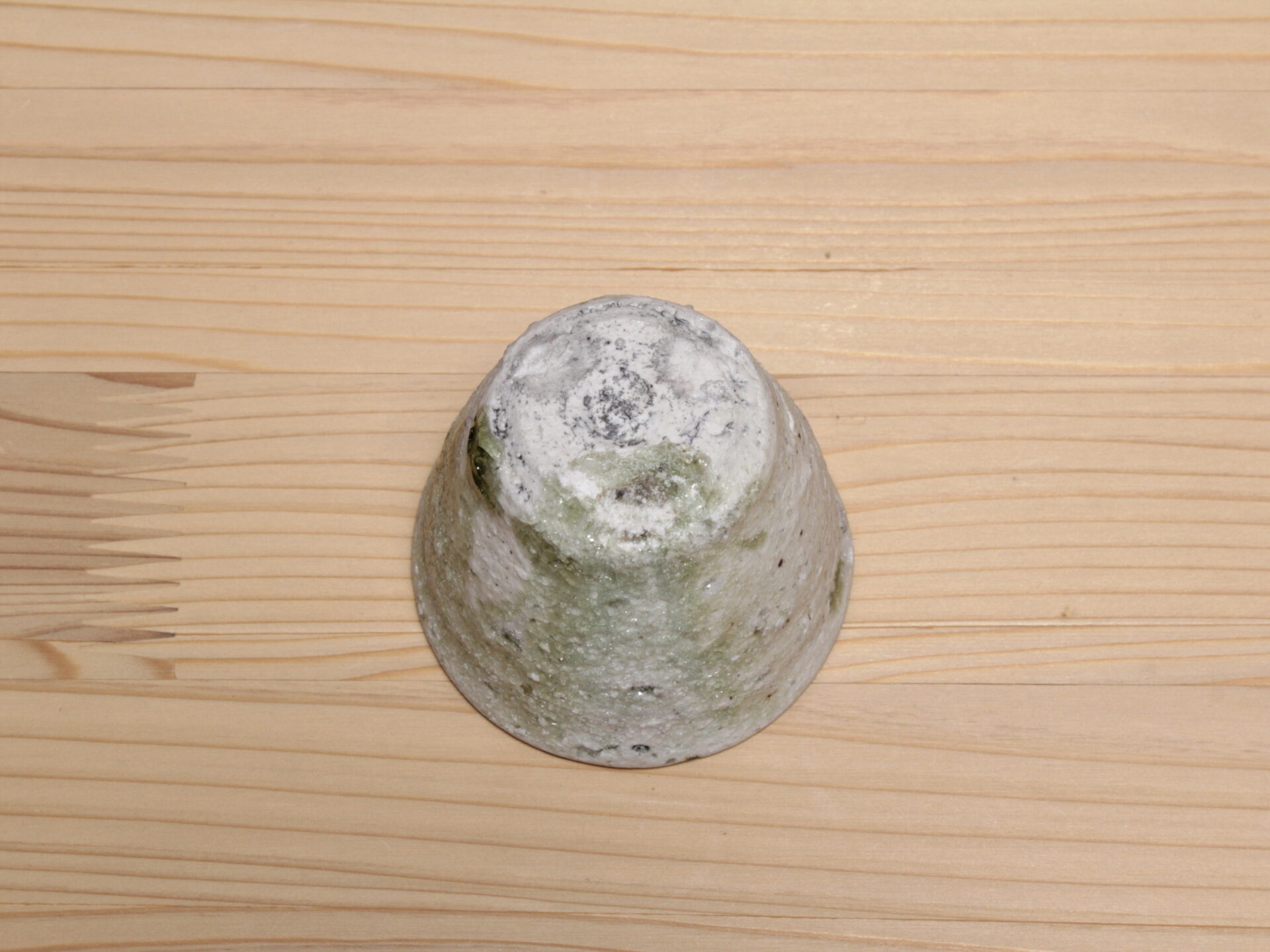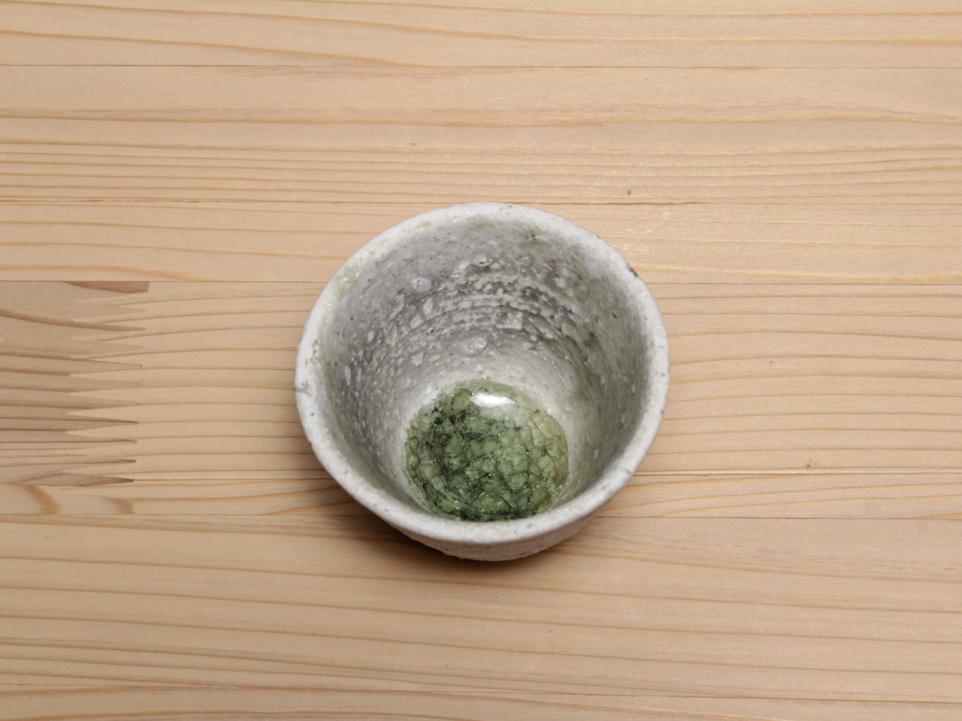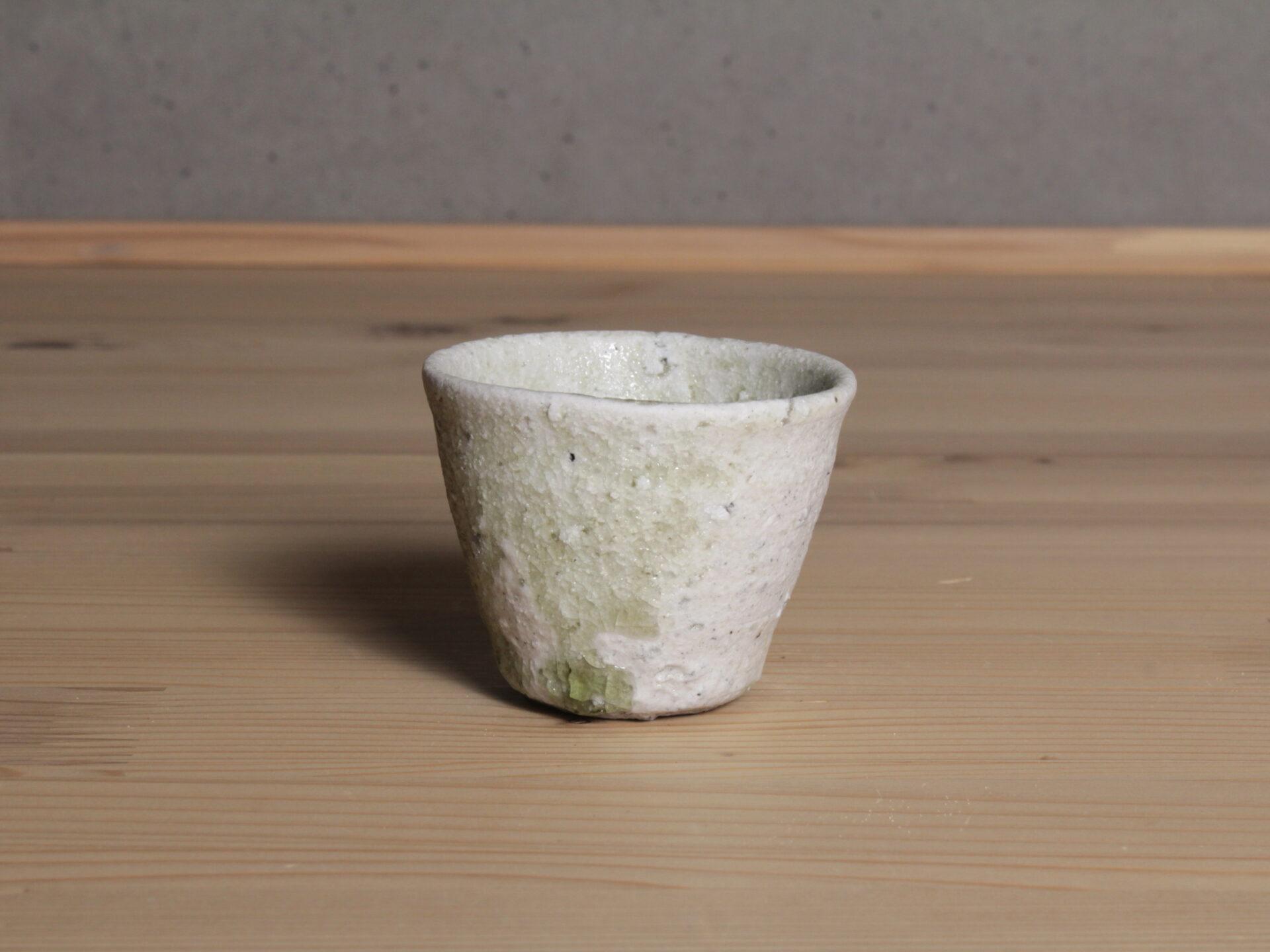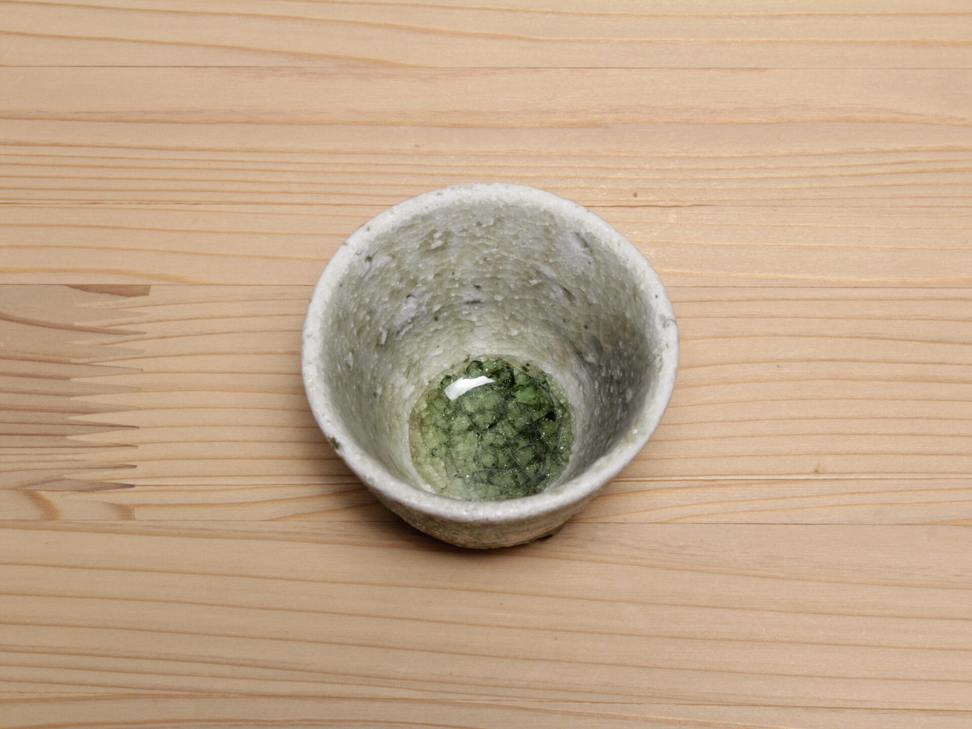 辻村唯さんの自然釉ぐい吞です。小りながらも丹精な末広形の造形。穴窯で強還元焼成されることにより、素朴な須恵器のような硬質な土肌に、美しいエメラルドグリーンの自然釉が魅力です。