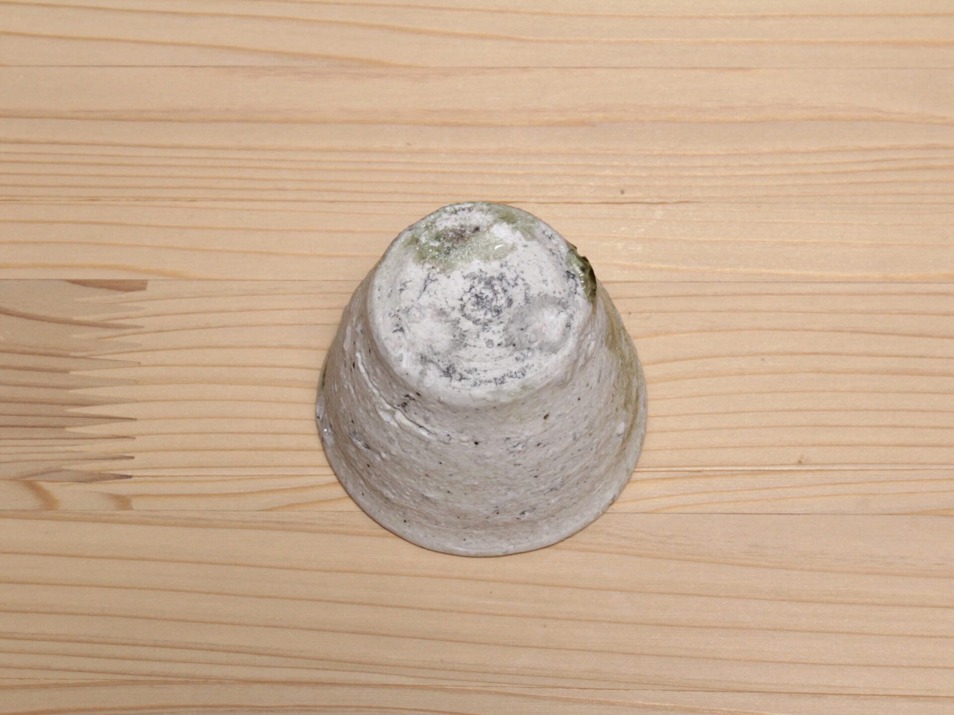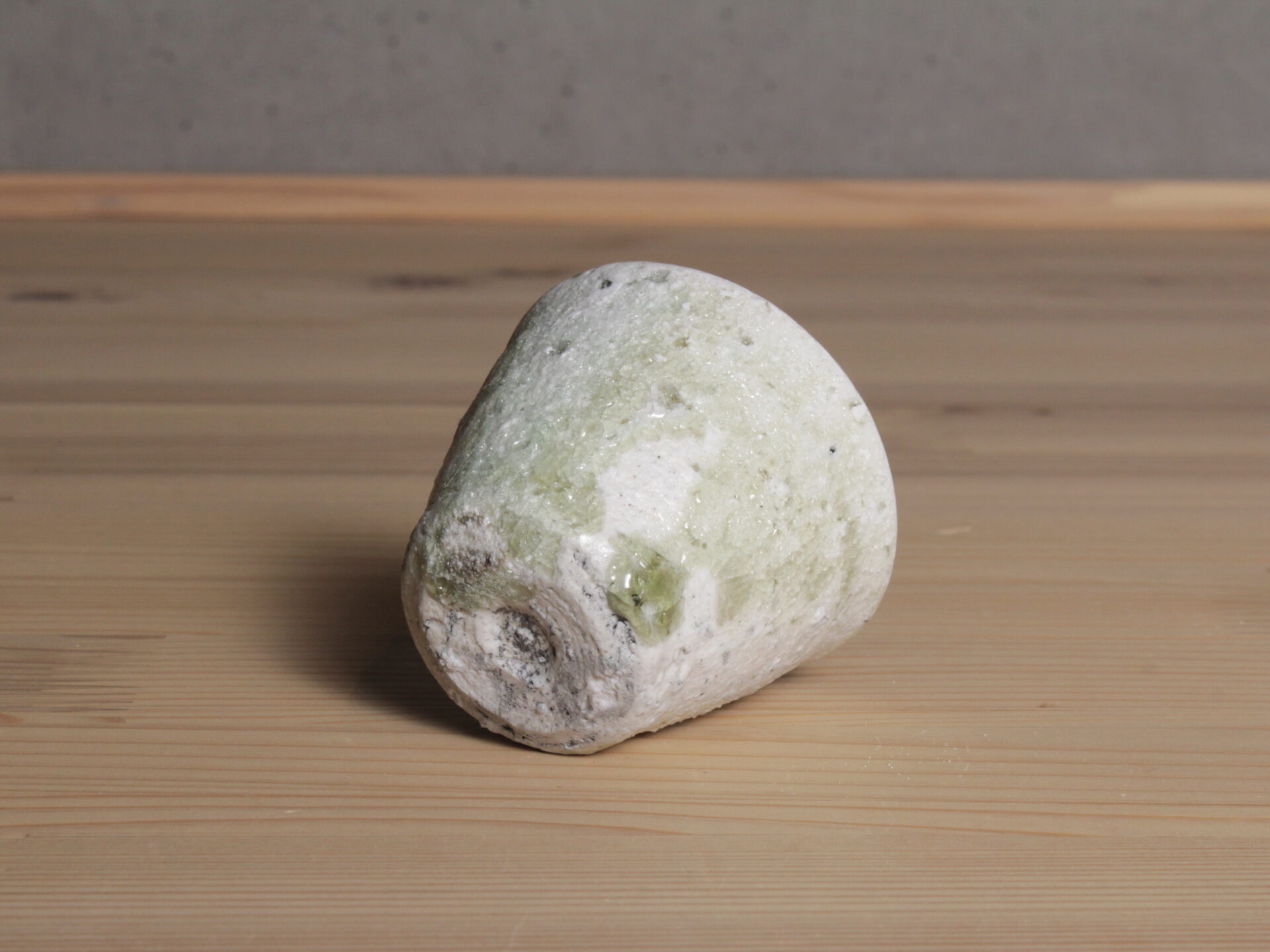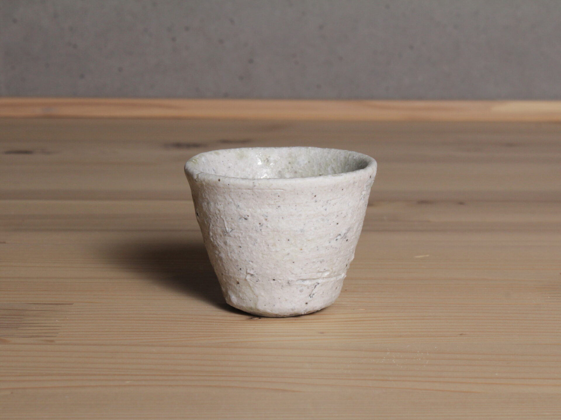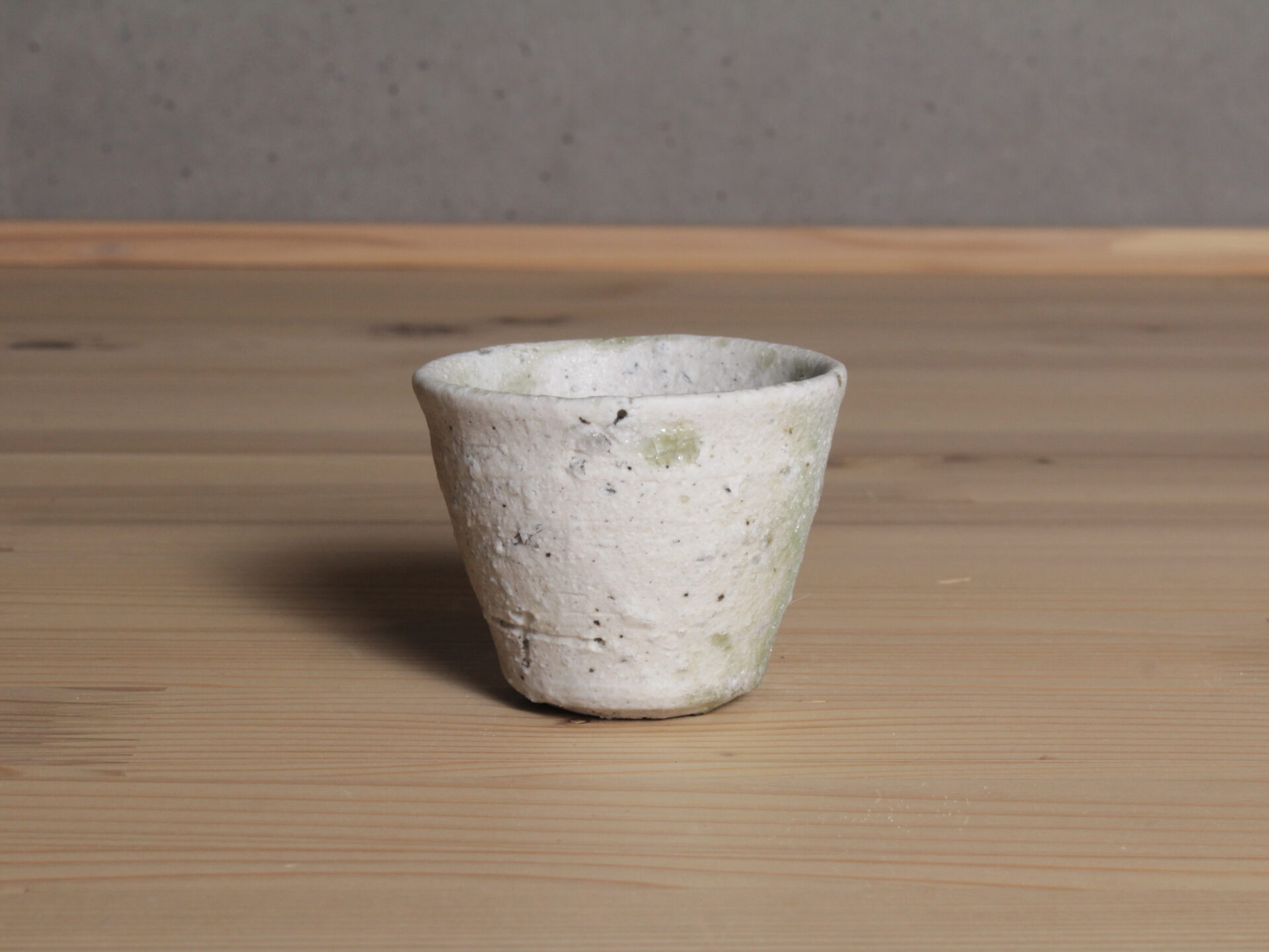 辻村唯さんの自然釉ぐい吞です。小りながらも丹精な末広形の造形。穴窯で強還元焼成されることにより、素朴な須恵器のような硬質な土肌に、美しいエメラルドグリーンの自然釉が魅力です。