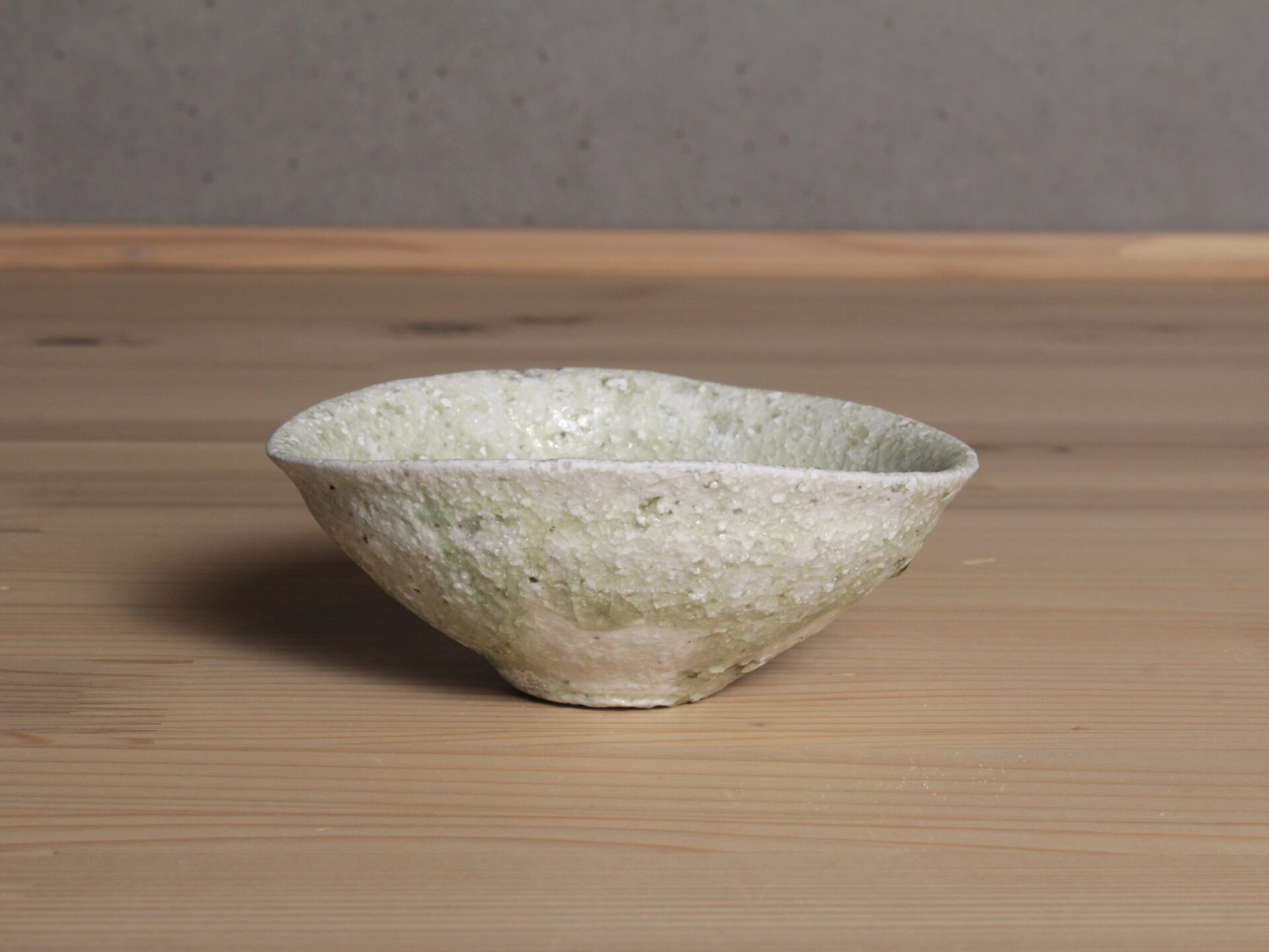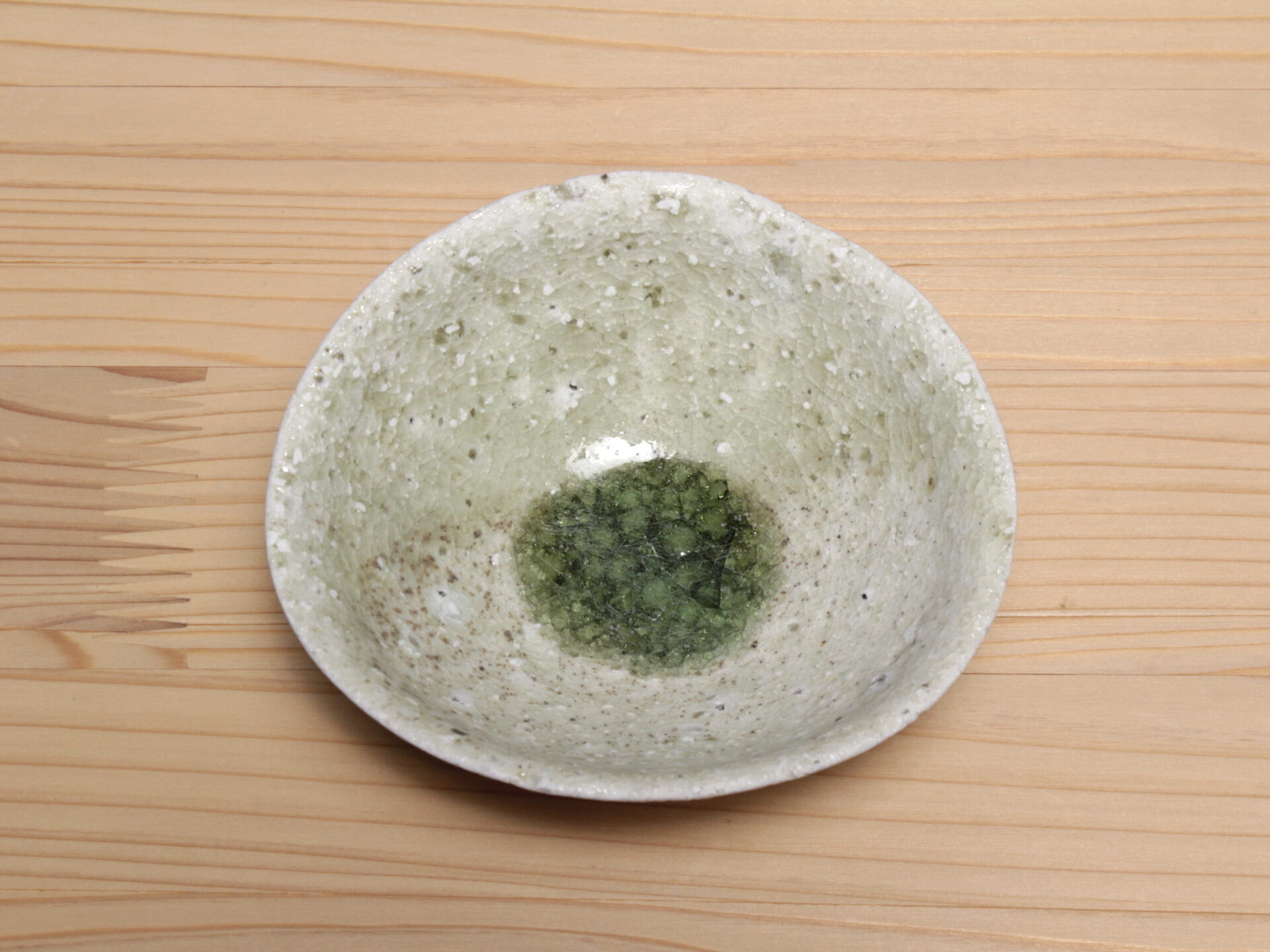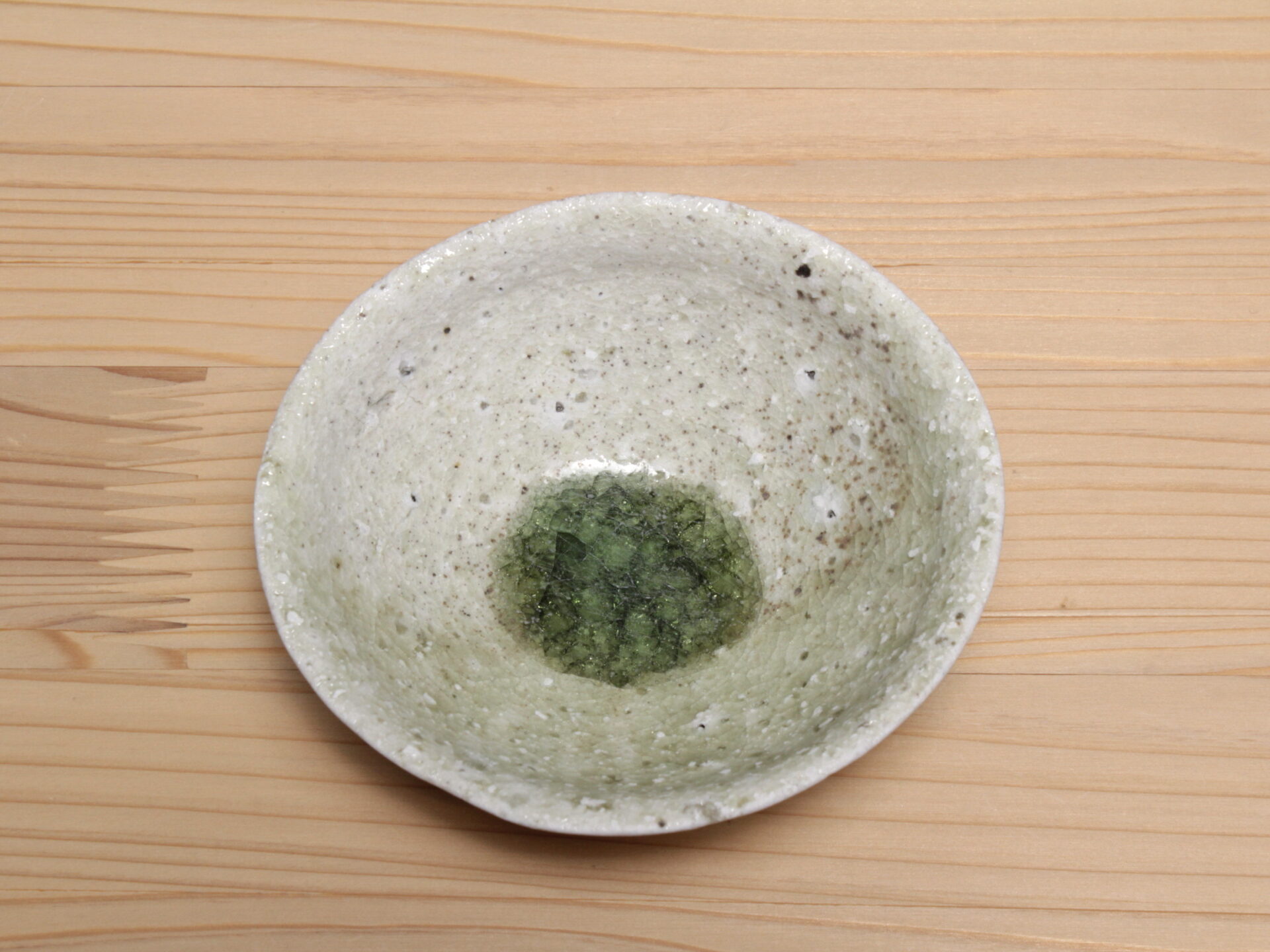 辻村唯さんの自然釉盃です。大ぶりで浅い碗形のフォルム。穴窯で強還元焼成されることにより、素朴な須恵器のような硬質な土肌に、美しいエメラルドグリーンの自然釉が魅力です。