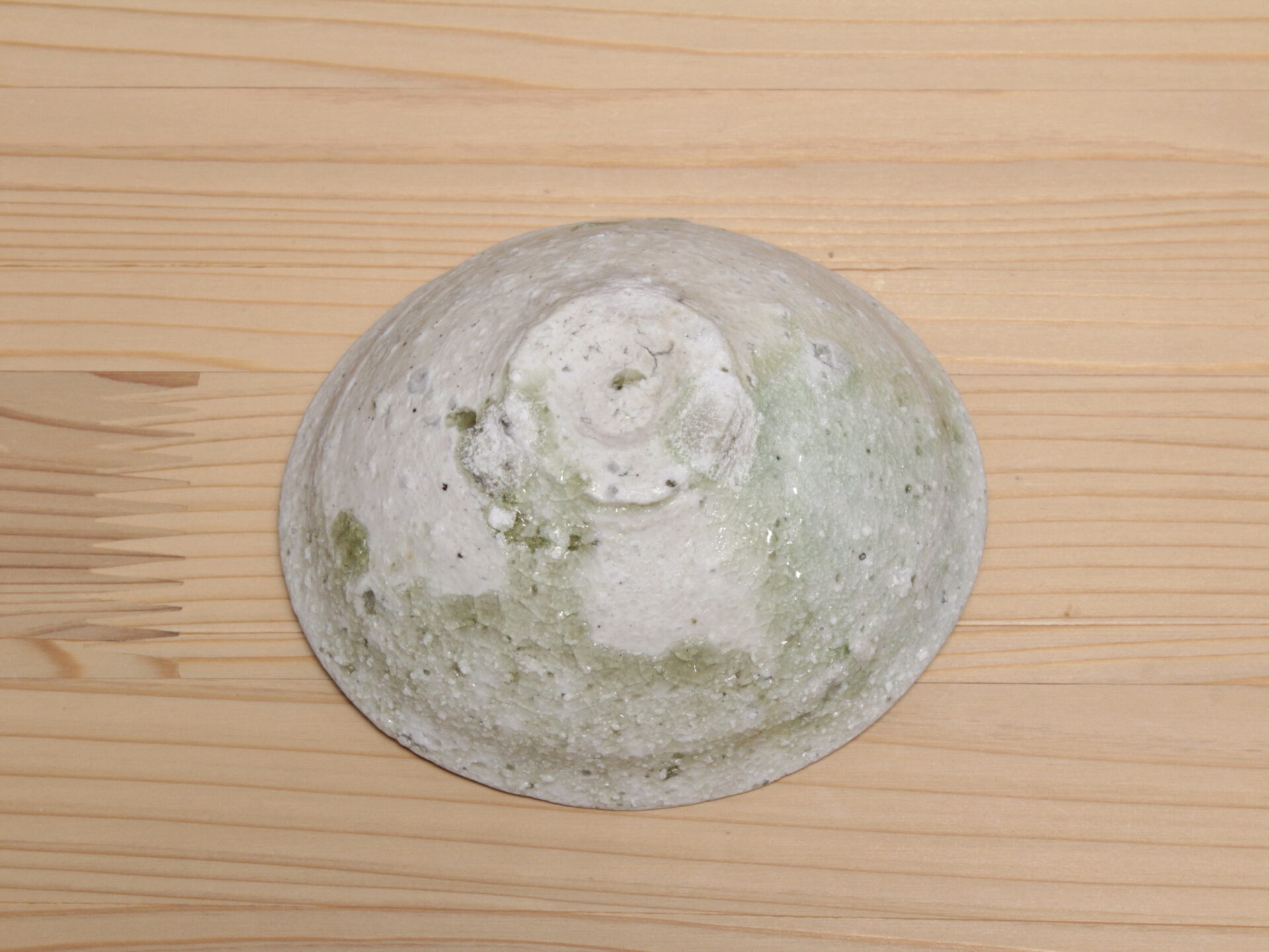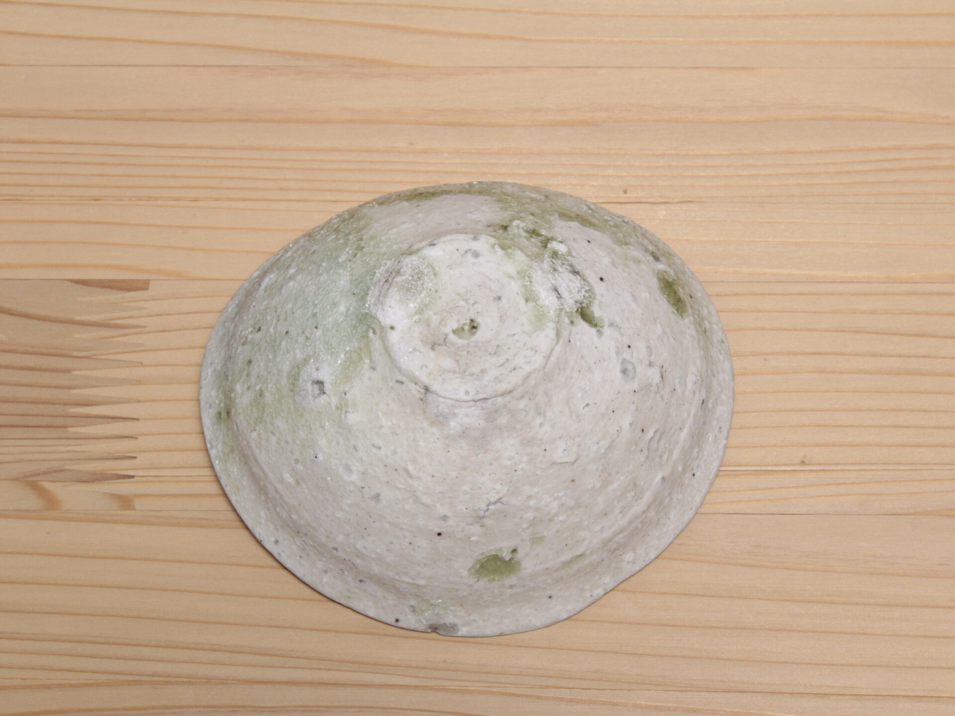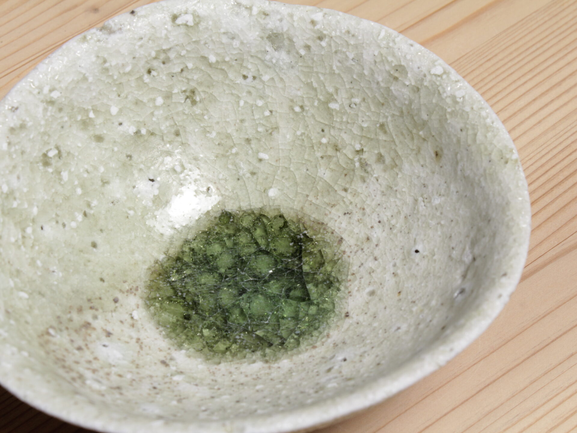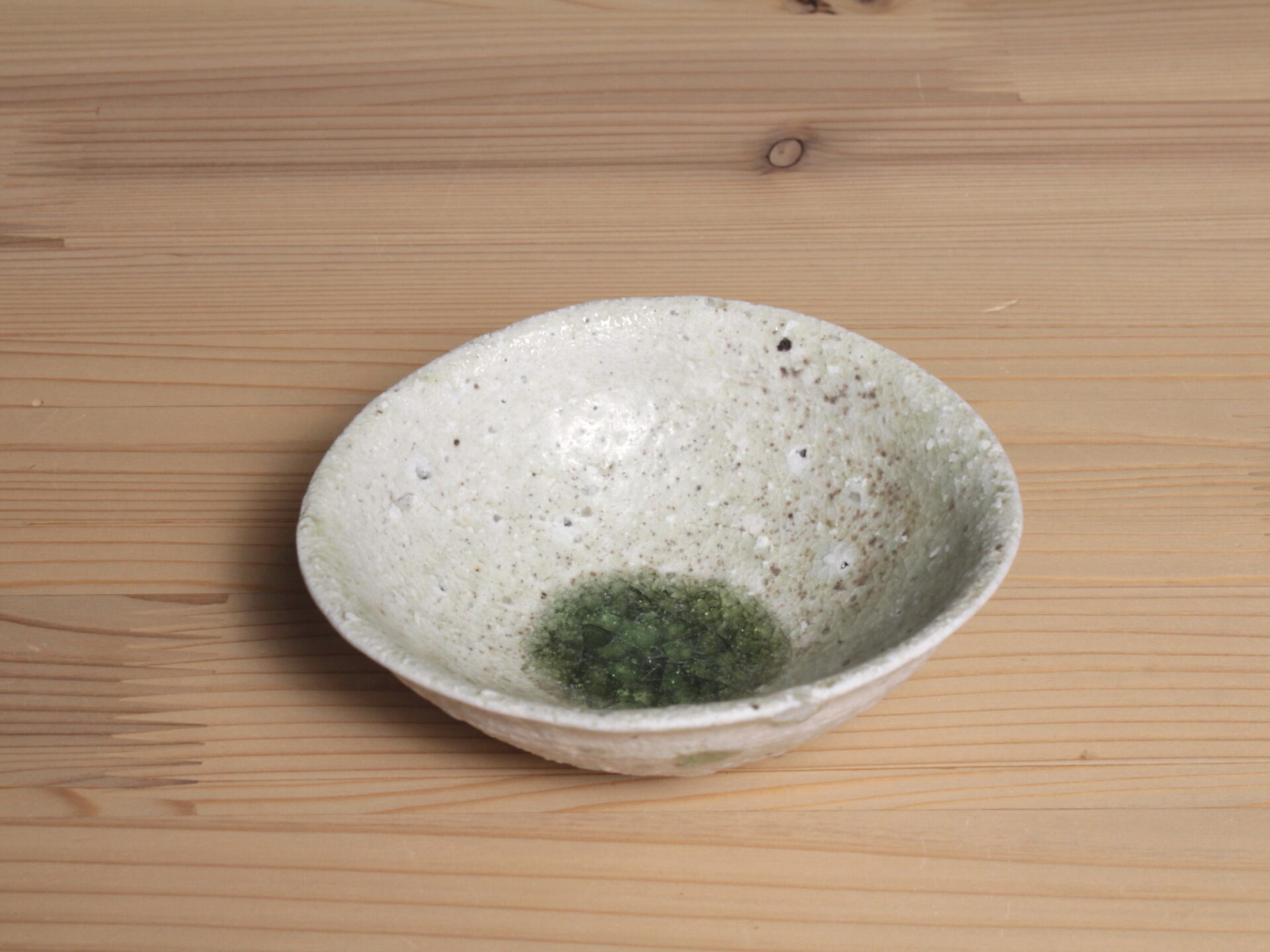 辻村唯さんの自然釉盃です。大ぶりで浅い碗形のフォルム。穴窯で強還元焼成されることにより、素朴な須恵器のような硬質な土肌に、美しいエメラルドグリーンの自然釉が魅力です。
