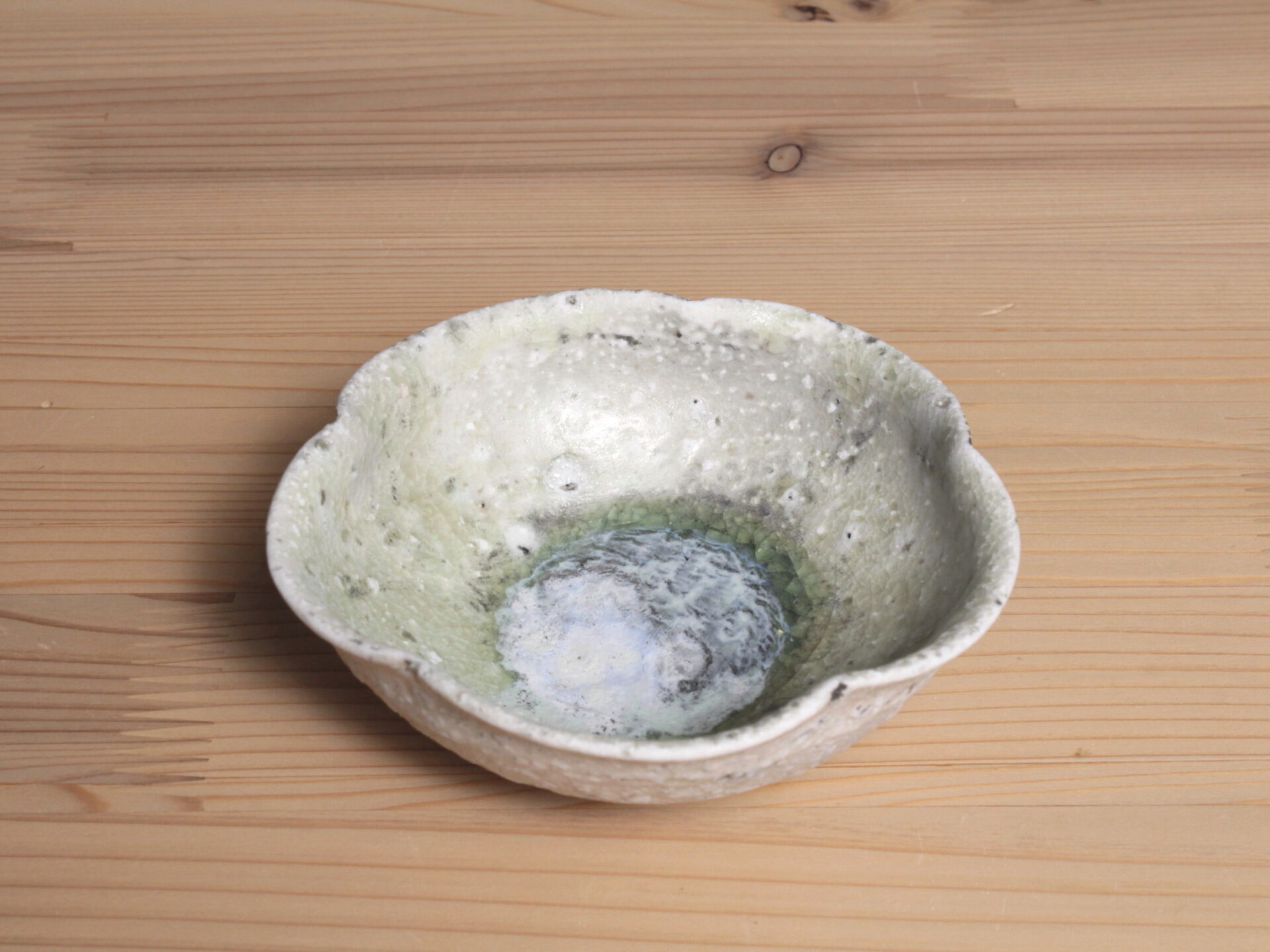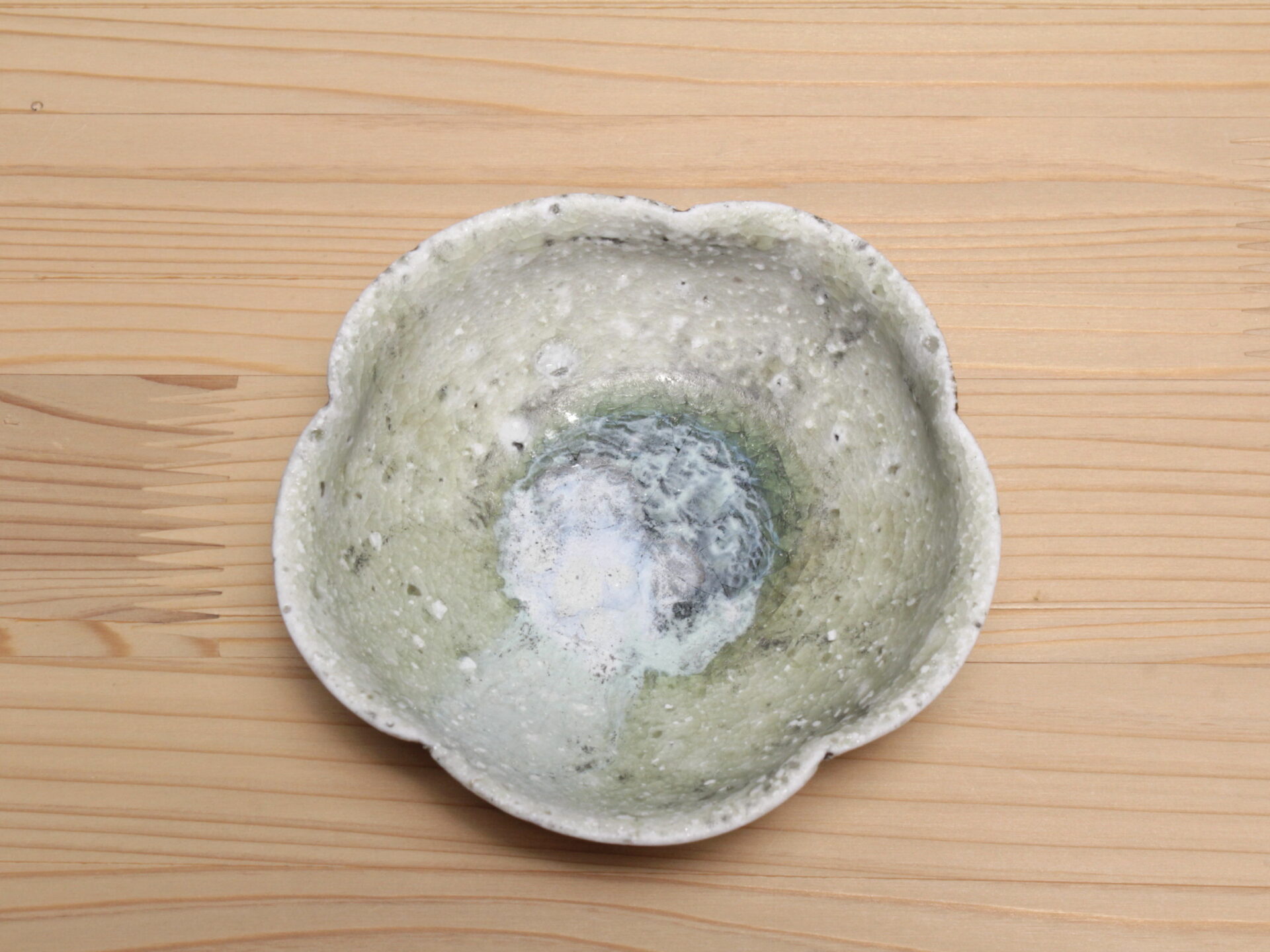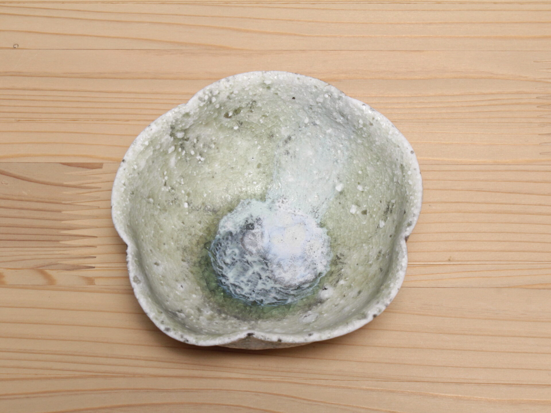 辻村唯さんの自然釉輪花盃です。無造作な五弁輪花の浅い碗形。見込みのエメラルドグリーンの自然釉に、白濁した降りものが面白い景色となっています。
