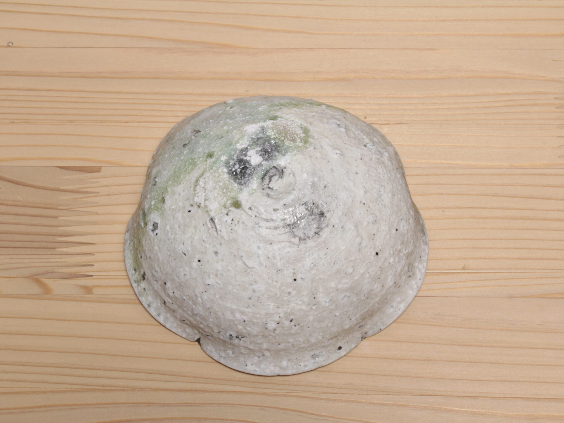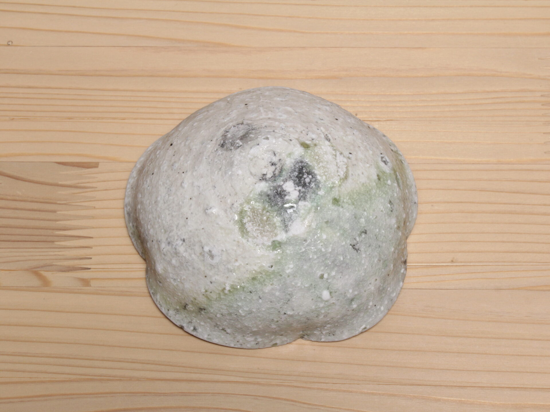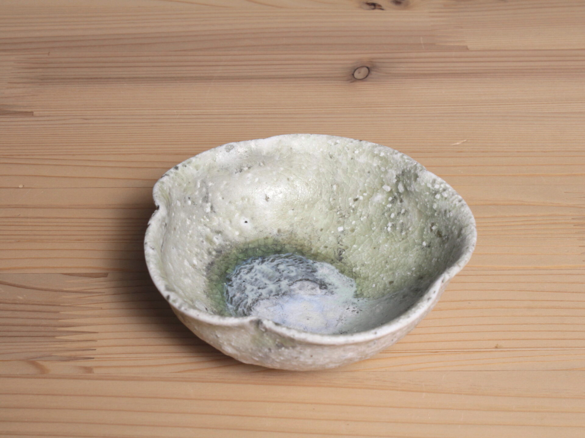 辻村唯さんの自然釉輪花盃です。無造作な五弁輪花の浅い碗形。見込みのエメラルドグリーンの自然釉に、白濁した降りものが面白い景色となっています。