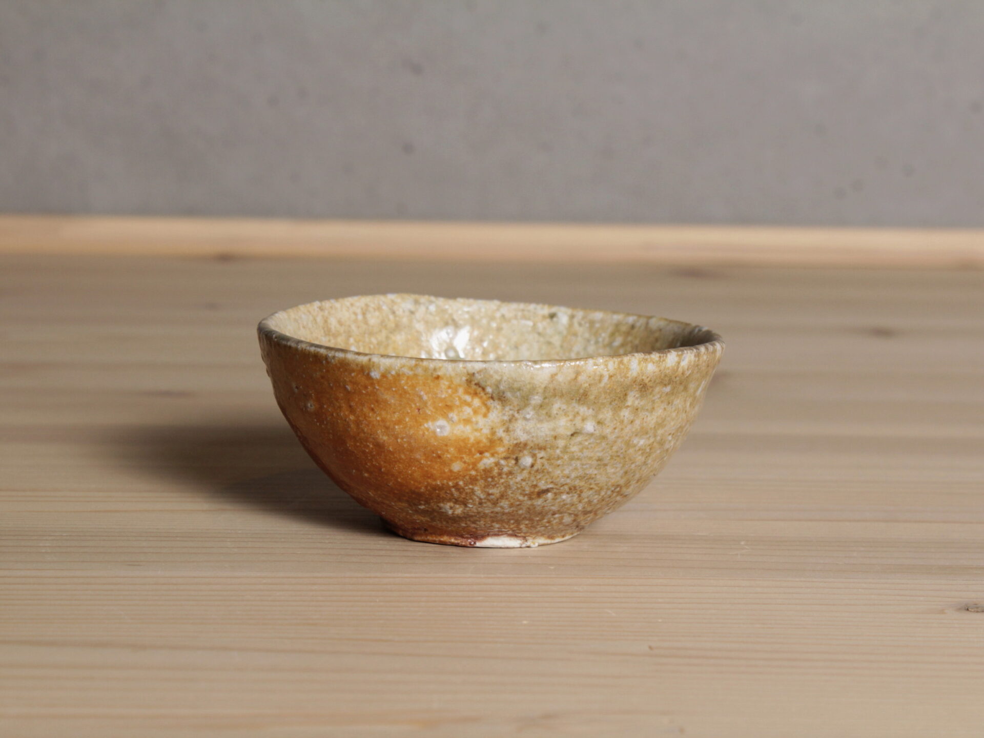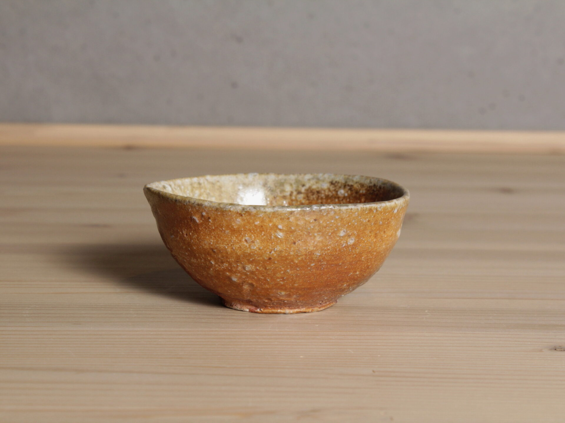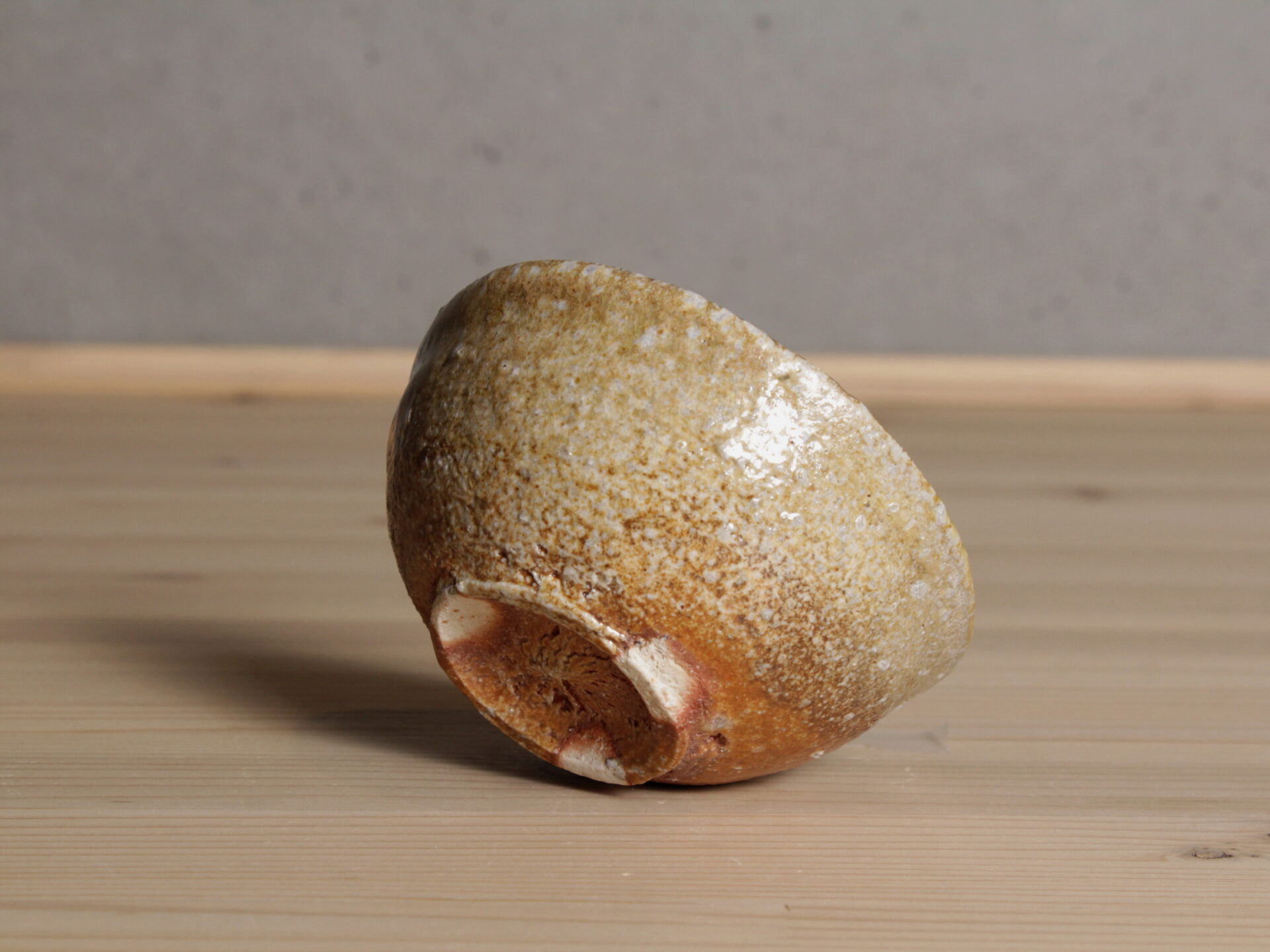 岸野寛さんの伊賀盃です。懐の深い朝顔形の碗形。穴窯でじっくり焼成された土肌は、しっとりとした緋色と灰被、見込みには自然釉によるビードロが美しい景色です。