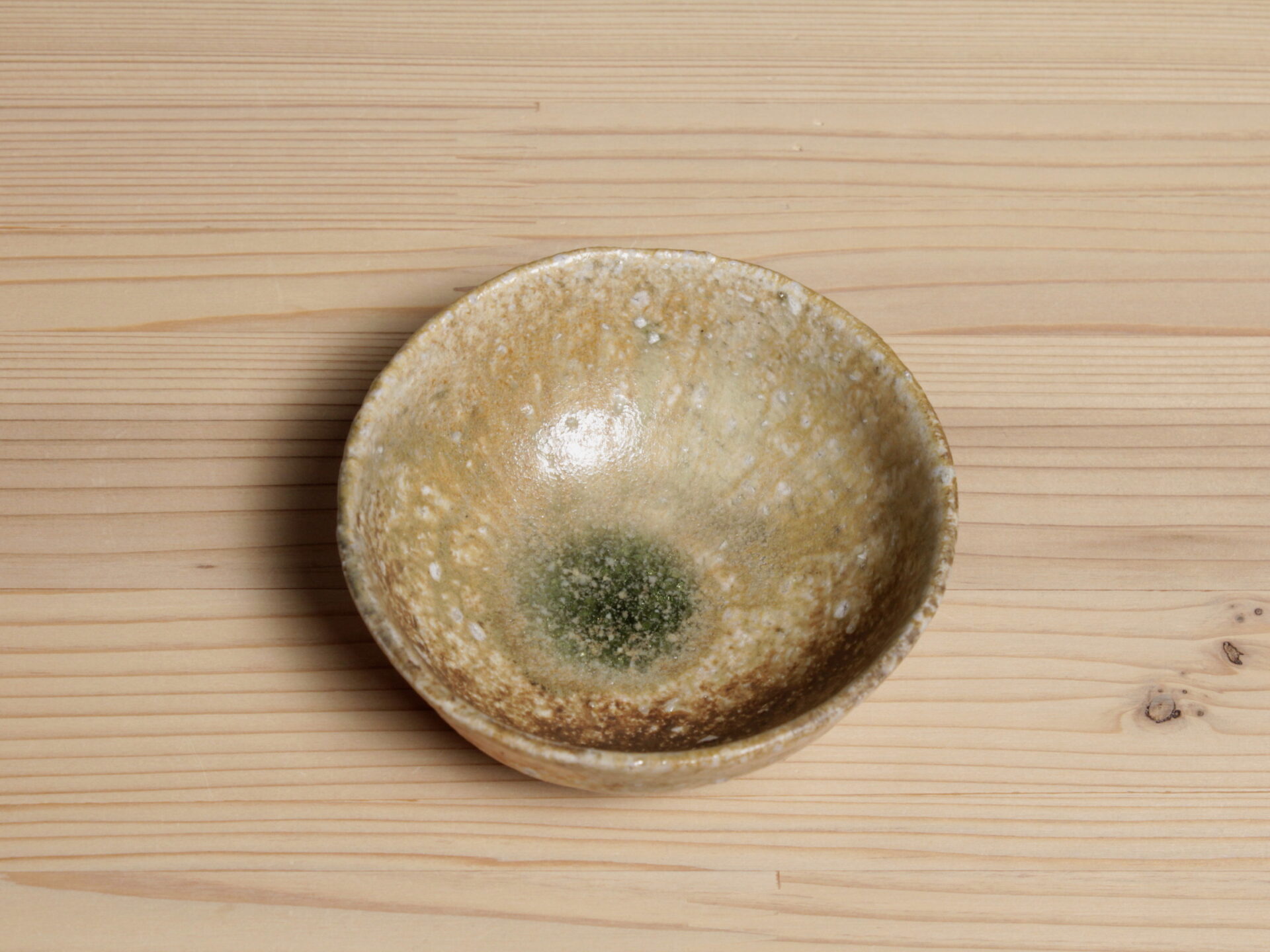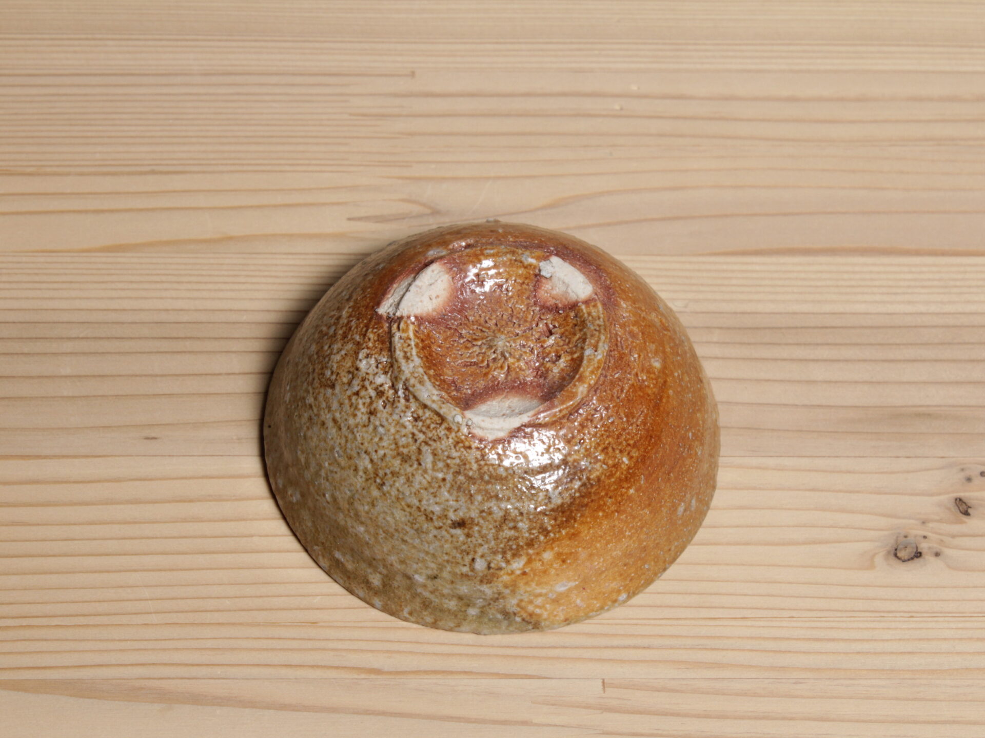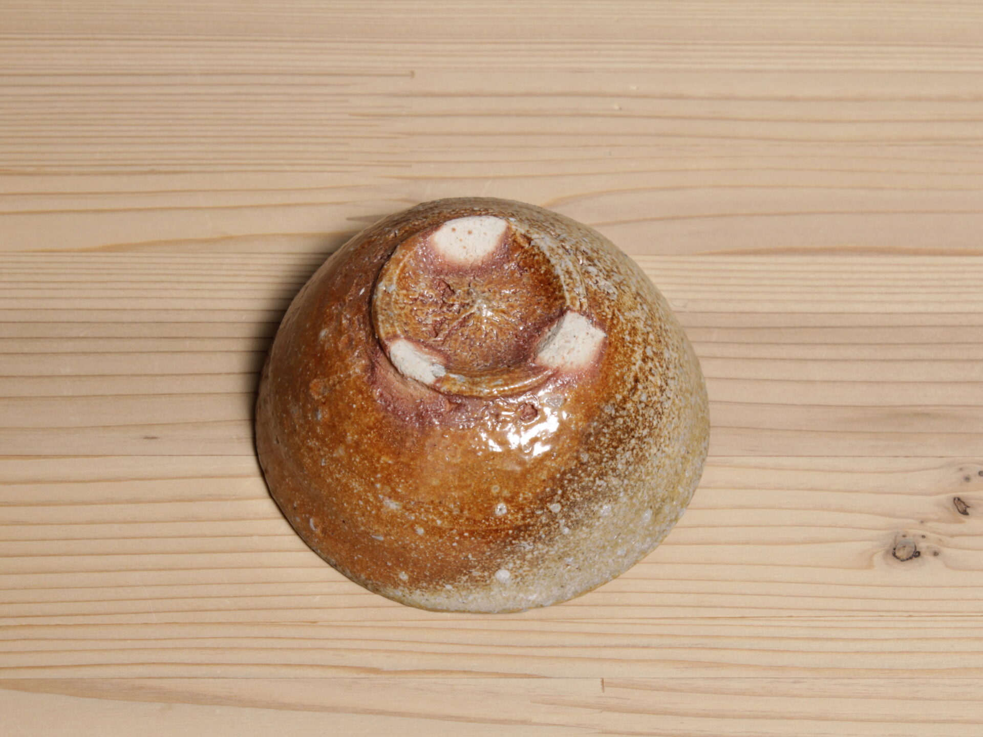 岸野寛さんの伊賀盃です。懐の深い朝顔形の碗形。穴窯でじっくり焼成された土肌は、しっとりとした緋色と灰被、見込みには自然釉によるビードロが美しい景色です。