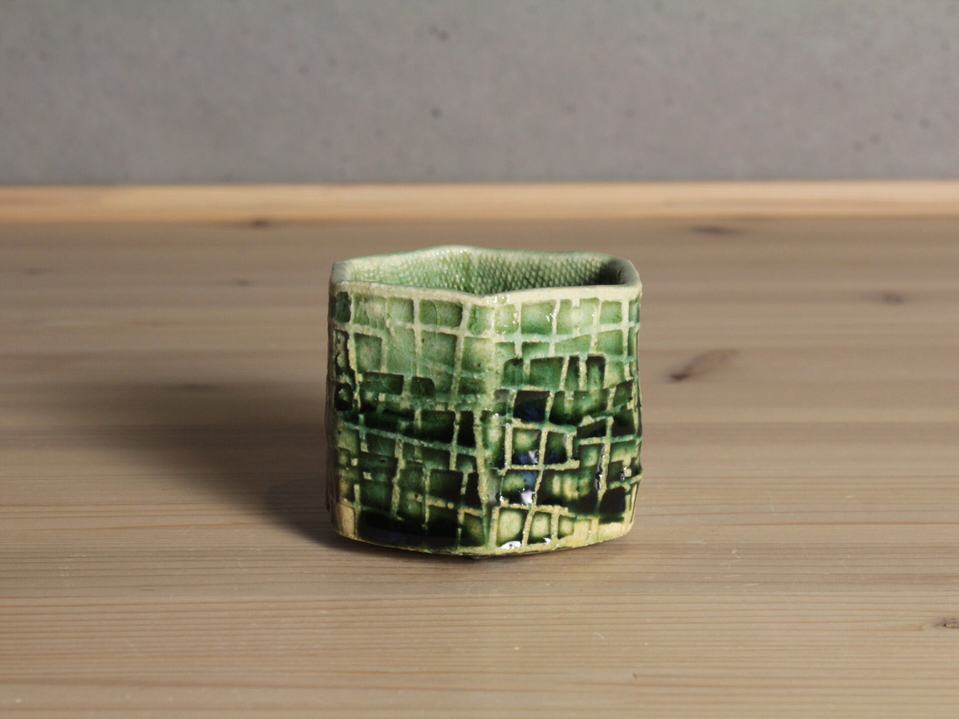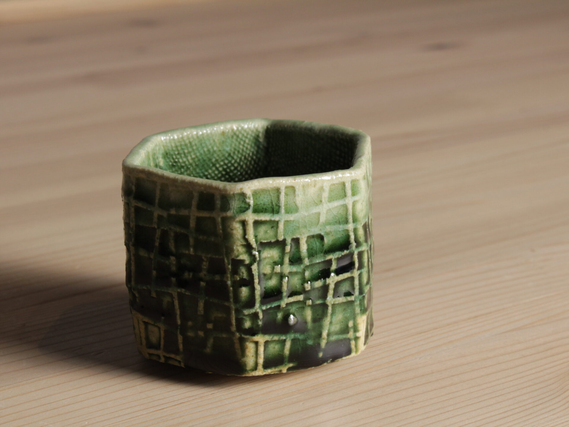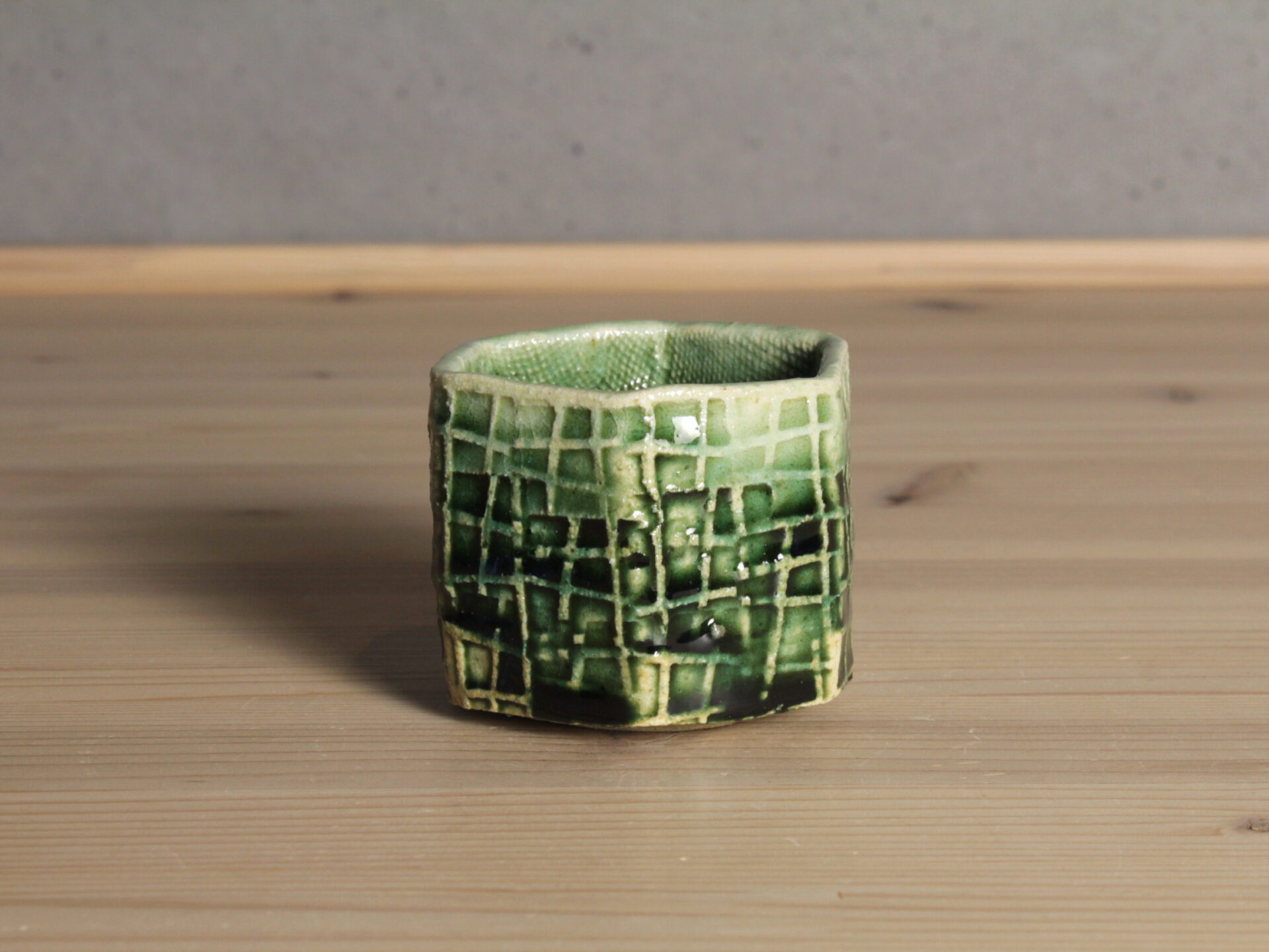 鈴木徹さんの緑釉酒呑です。型打ちによる六角筒型の成形。印紋が映し出す清涼感ある緑釉のグラデーションが美しい酒盃。