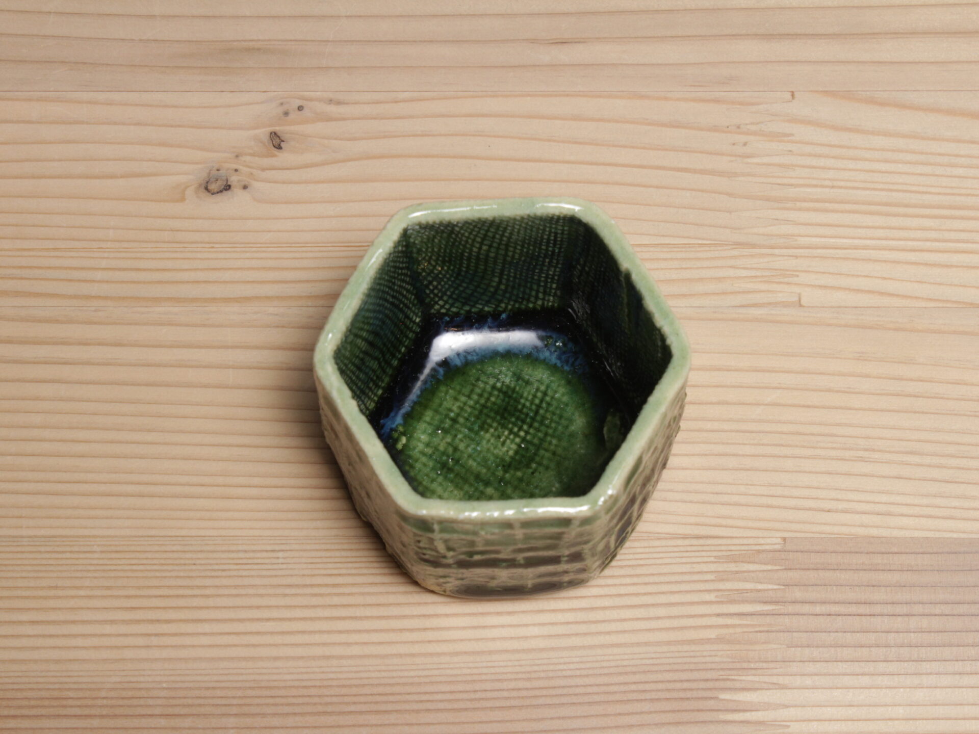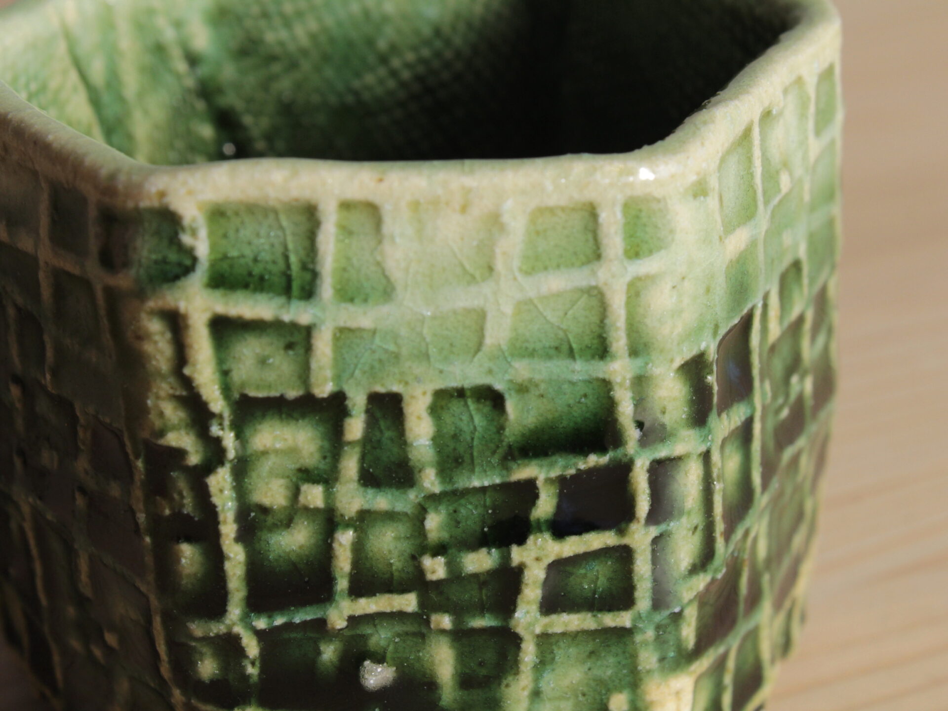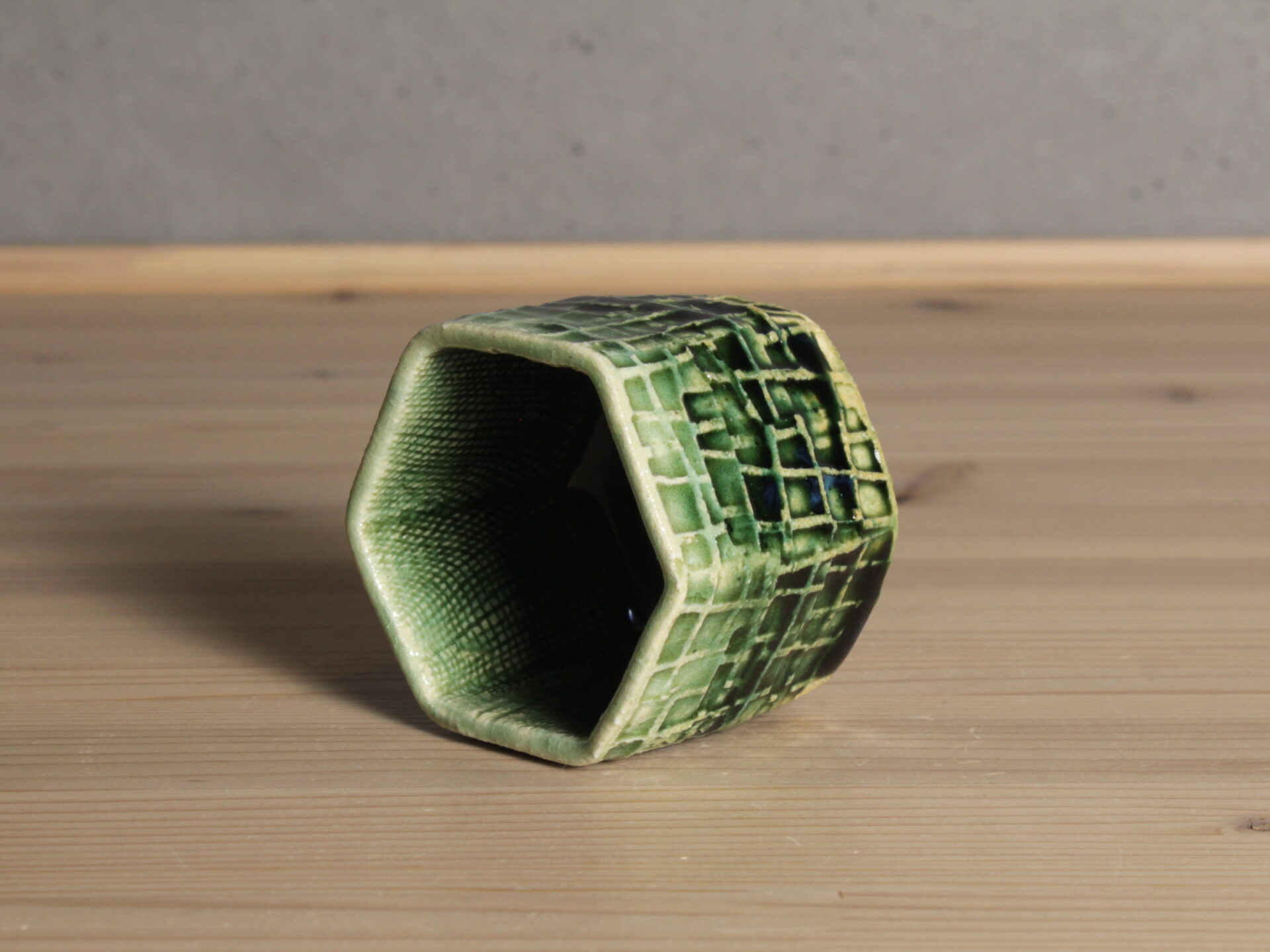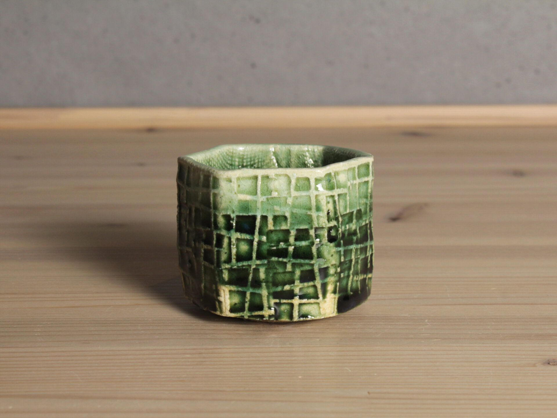 鈴木徹さんの緑釉酒呑です。型打ちによる六角筒型の成形。印紋が映し出す清涼感ある緑釉のグラデーションが美しい酒盃。